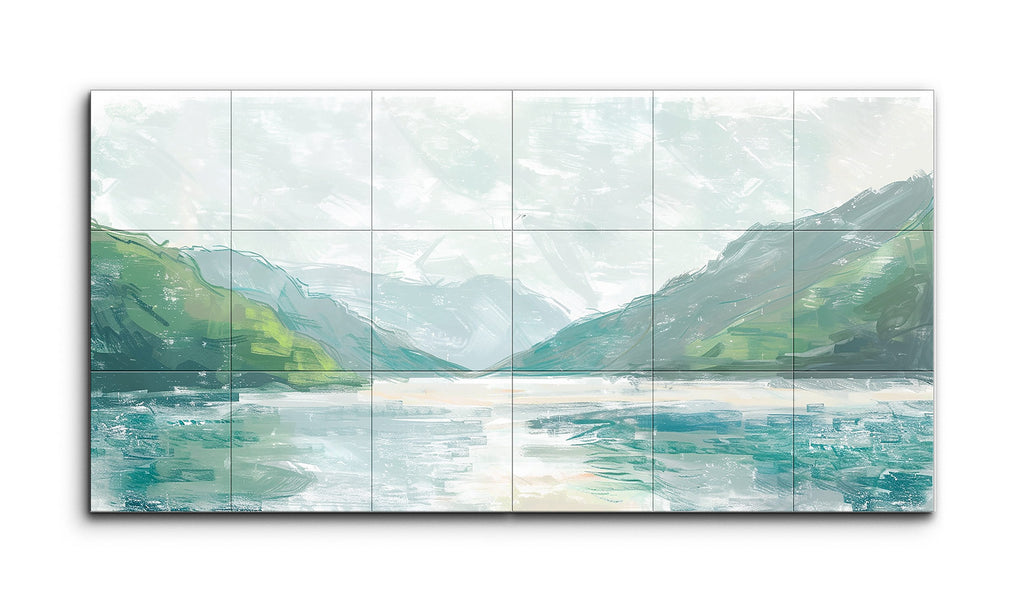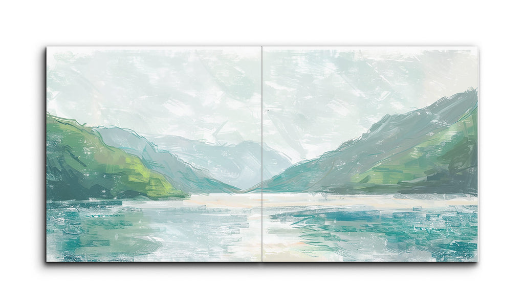 This diptych tile mural captures a serene landscape, likely a mountainous region by a tranquil lake or sea. The artwork blends abstract and impressionistic styles with loose, expressive brushstrokes. Dominated by cool blues and greens, the scene evokes natural water and vegetation hues, while whites and lighter tones hint at reflections and mist. Darker strokes define the mountains, and horizontal strokes convey the water's calmness. The interplay of light creates depth and a focal point, drawing the viewer into the vast, peaceful landscape.