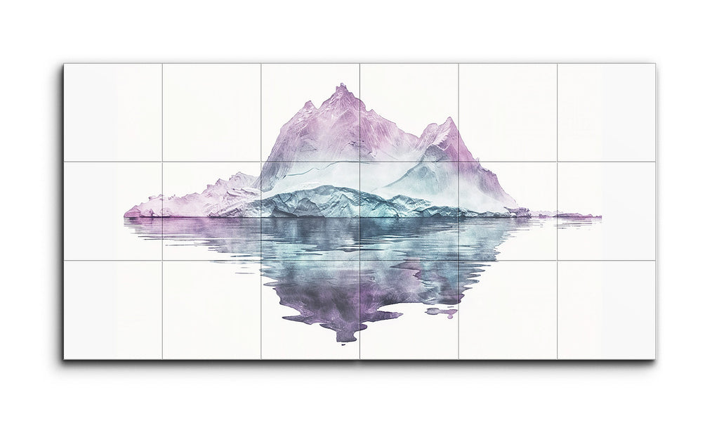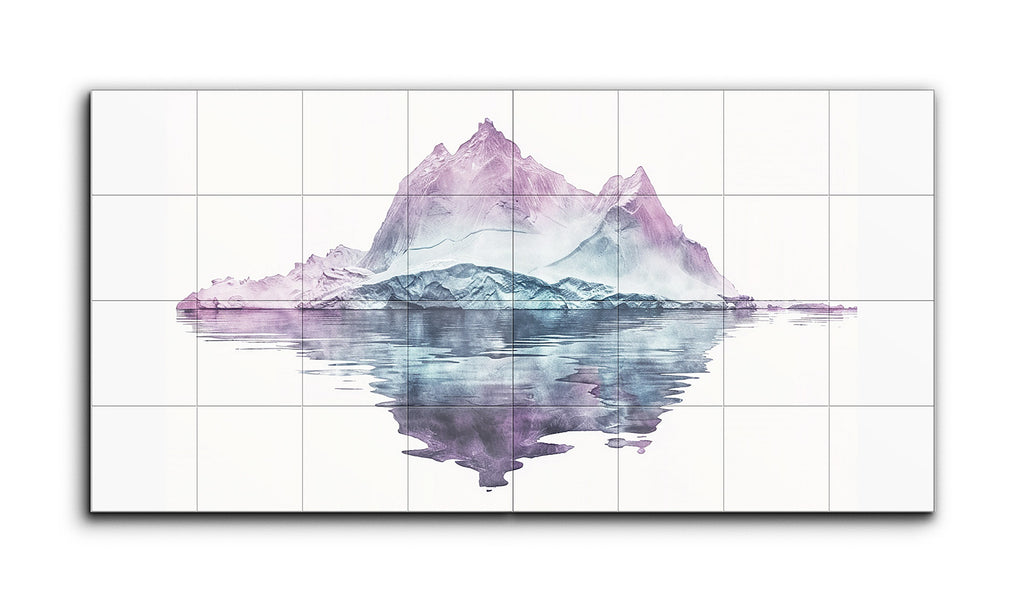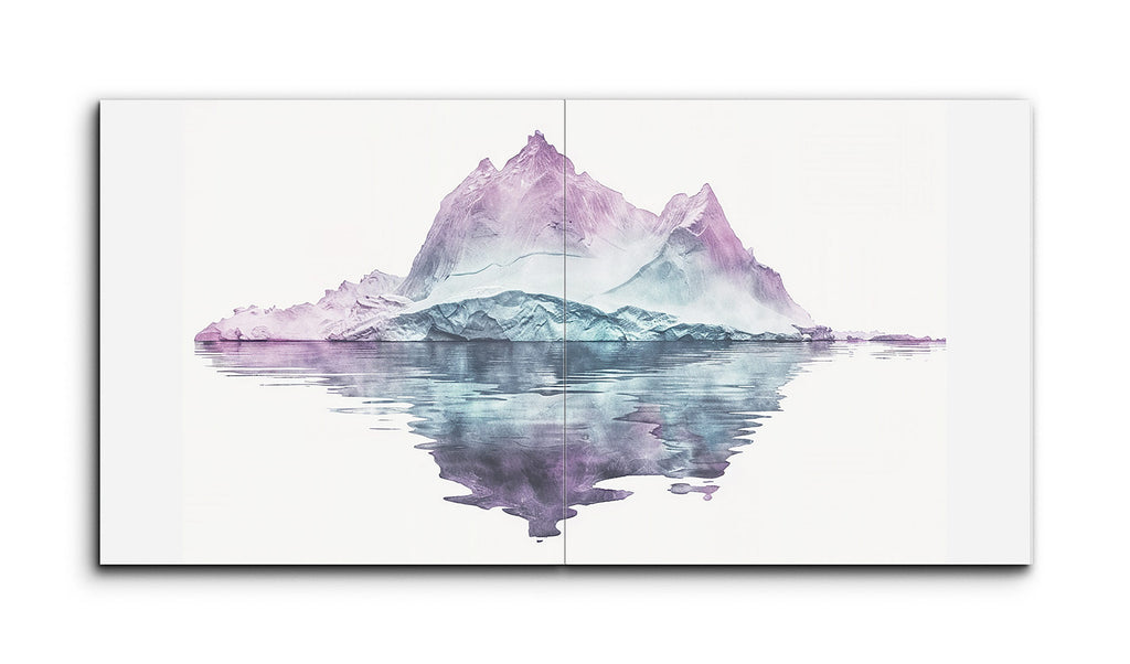 The artwork showcases a serene mountain landscape in a diptych format, split between two panels. Rendered in an abstract style with watercolors, it features soft, flowing lines in shades of purple and blue, suggesting a tranquil and cool environment. A body of water below mirrors the mountains, creating a symmetrical balance that enhances the peaceful atmosphere. The minimalist approach, limited color palette, and emphasis on form create a tranquil scene that invites quiet contemplation and appreciation of natural beauty.