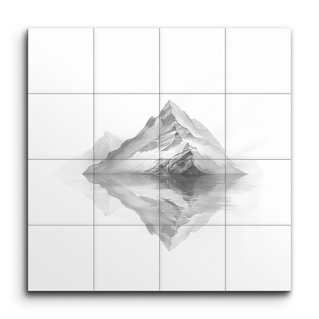 Immerse yourself in the serene beauty of nature with this exquisite tile mural. The artwork showcases a meticulously detailed pencil drawing of a majestic mountain, perfectly mirrored in a tranquil body of water below. The minimalist style emphasizes the natural symmetry and quiet elegance of the scene, with intricate shading and fine lines bringing the landscape to life. This captivating composition captures a moment of stillness, offering a sense of depth, realism, and profound tranquility.