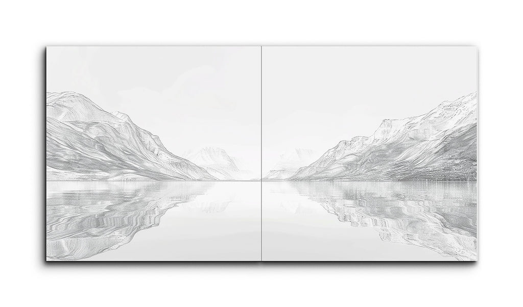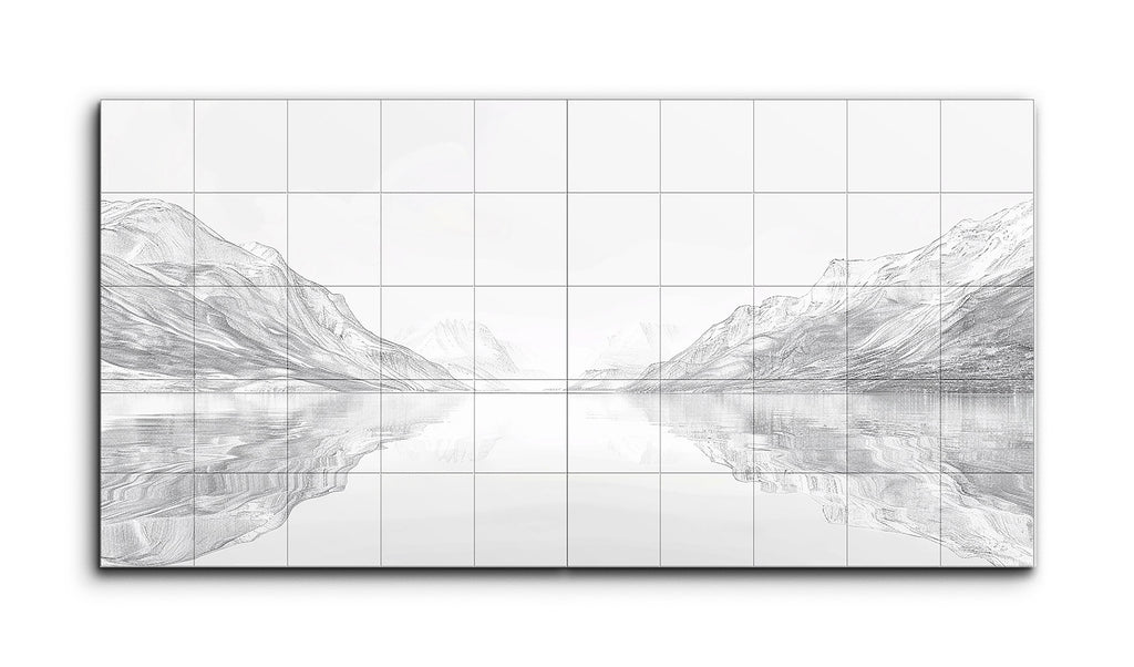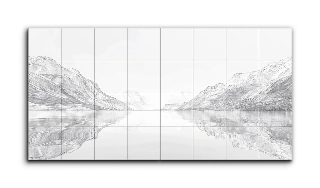 This tile mural presents a serene and expansive landscape with a large body of water flanked by mountain ranges on both sides. The symmetrical composition showcases mountains reflected perfectly in the still water, creating a mirrored effect. Rendered in fine, delicate lines, the mountains have an ethereal quality, enhanced by a monochromatic palette of grays. Subtle ripples and reflections in the water, along with faint, wispy clouds in the clear sky, add to the tranquil, minimalist aesthetic.