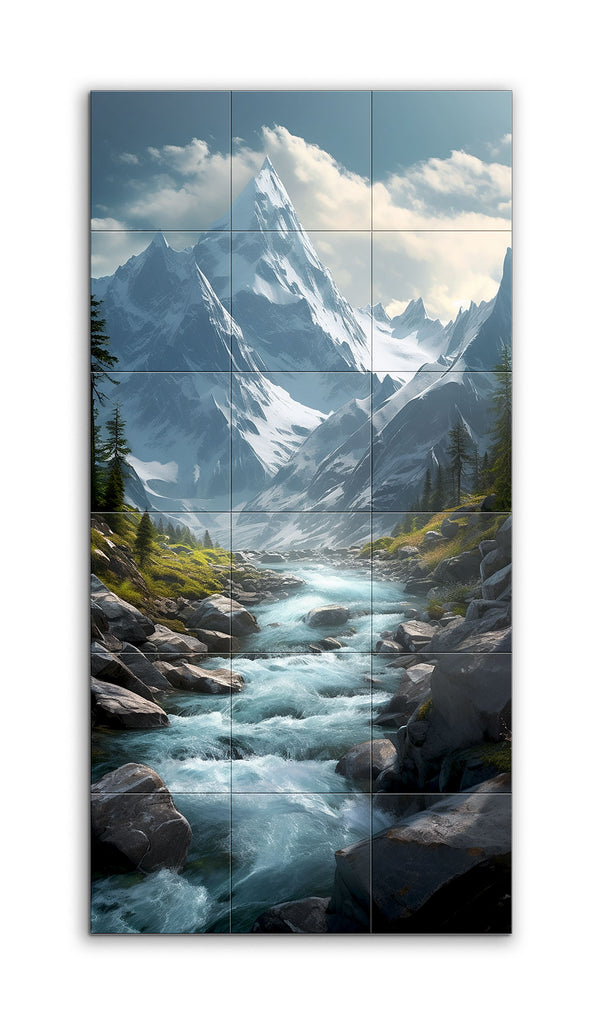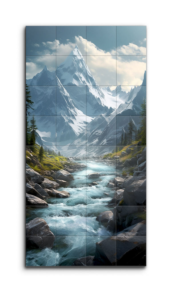This tile mural captures the breathtaking beauty of a mountainous landscape, centered around a clear, flowing river. The foreground showcases the river's vibrant blue waters rushing over smooth rocks, creating dynamic white water. Lush greenery, including grass and small shrubs, flanks the river and transitions into a dense evergreen forest. In the middle ground, jagged, snow-capped mountains rise with intricate detail, leading to a towering peak that pierces the soft blue sky dotted with scattered clouds. This dramatic composition emphasizes the grandeur and serene beauty of nature, inviting viewers to appreciate its depth and realism.