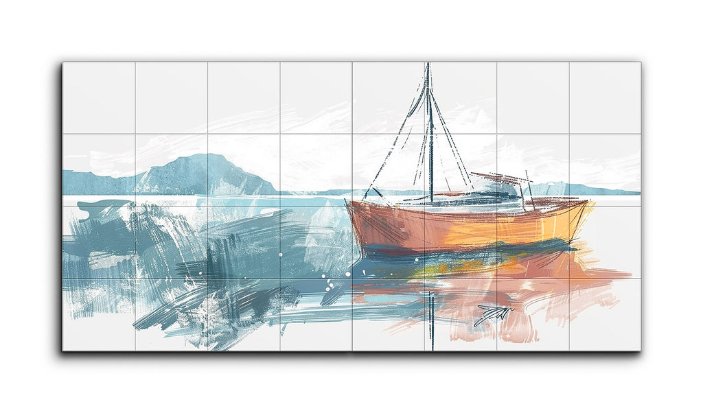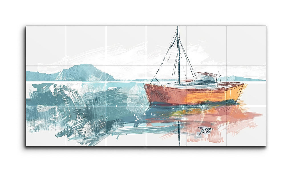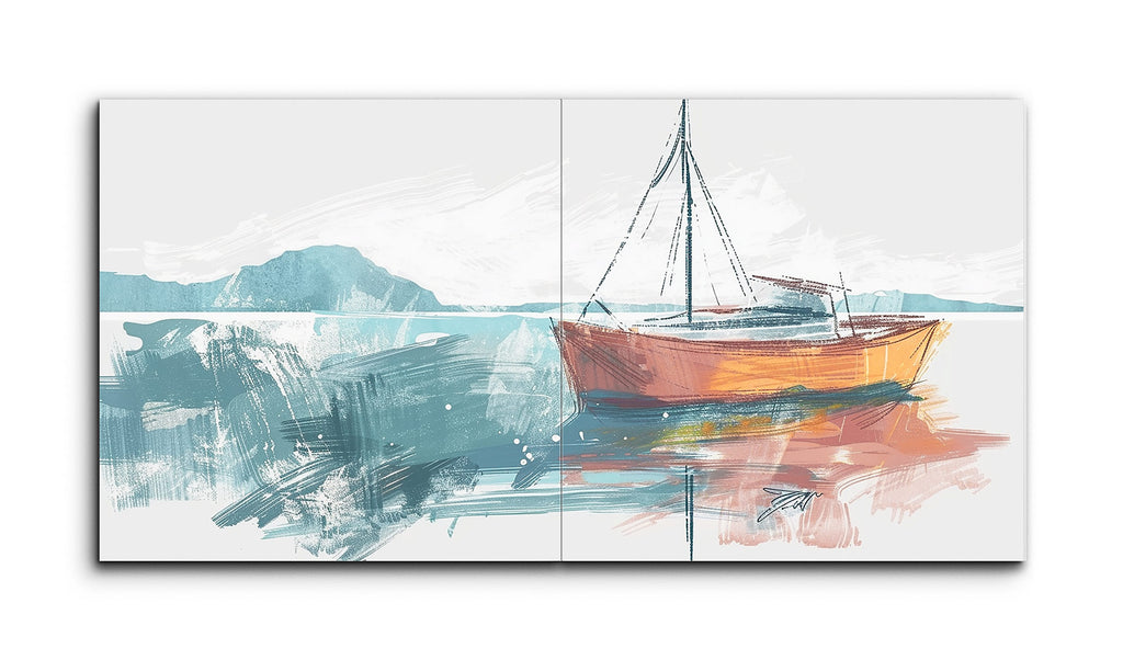 This modern abstract diptych captures a serene nautical scene. The focal point is a sailboat, painted in warm oranges and reds, its sails gently billowing in a light breeze. The boat glides on a body of water, depicted with horizontal brushstrokes in shades of blue and teal, accented by white reflections. The left panel hints at a distant landmass with broad strokes in cool blues and grays. The expressive brushwork and vibrant yet balanced colors evoke a sense of tranquility and invite emotional engagement.