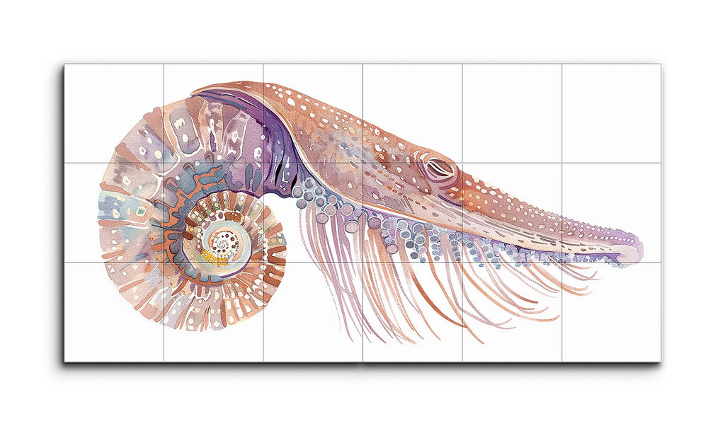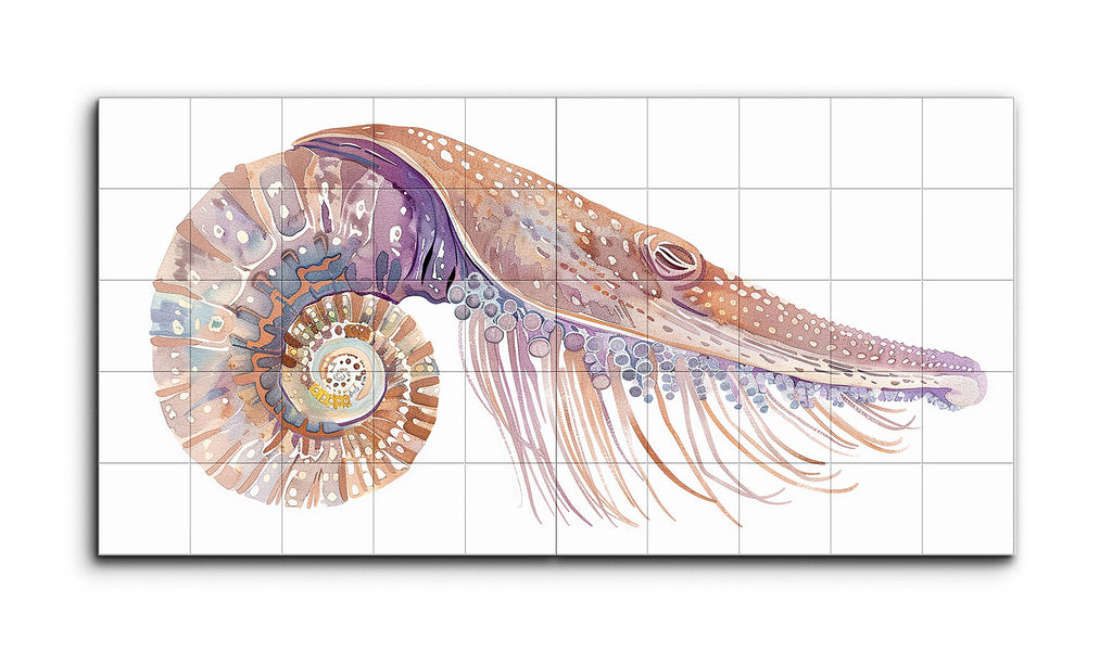 This two-panel tile mural presents a stylized and abstract nautilus, merged with elements reminiscent of a marine mammal, such as an elongated snout. The color palette of soft pastels—purple, pink, orange, and blue—evokes calm and serenity. The nautilus shell features intricate, whimsical spiral patterns, transitioning into a body with textured dots and lines. Elongated tentacles adorned with shapes and patterns suggest fluid movement, creating a dreamlike blend of abstraction and decorative art.