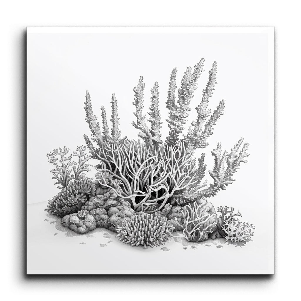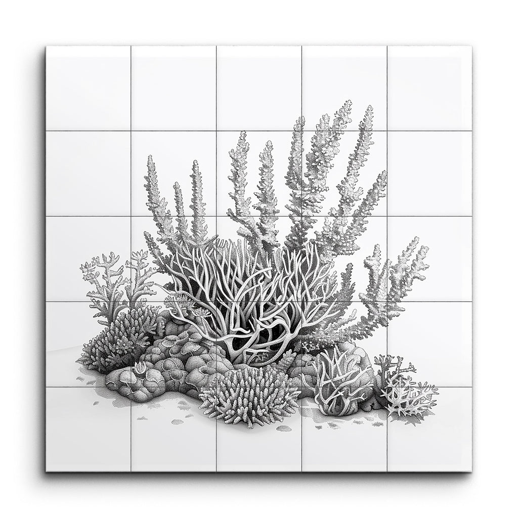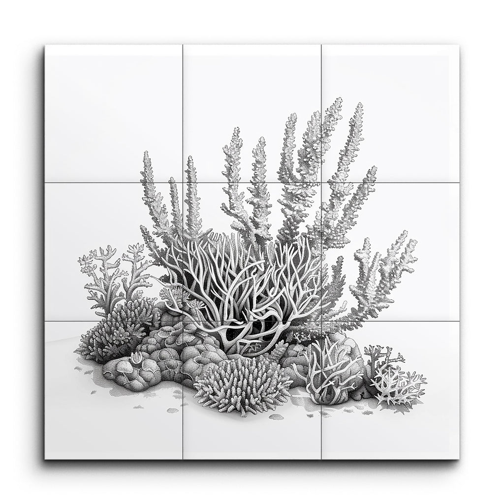 Immerse yourself in the serene beauty of the ocean with our exquisite tile mural, showcasing a meticulously detailed underwater scene. This monochromatic masterpiece, rendered in shades of gray, brings to life a variety of coral formations, from branching corals to brain corals. The highly realistic style captures the intricate textures and natural patterns of a coral reef, guiding the viewer's eye through a balanced and harmonious composition. Perfect for adding a touch of marine elegance to any space.