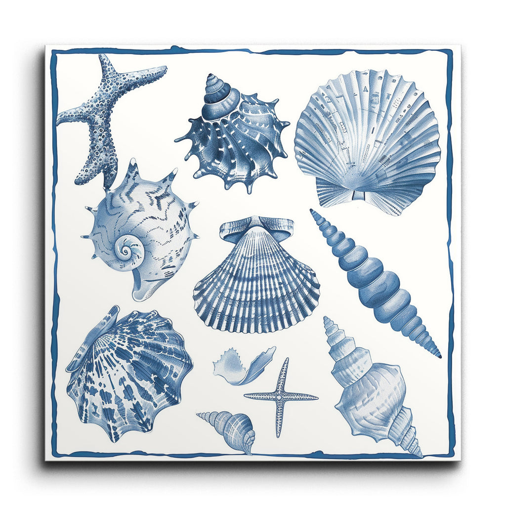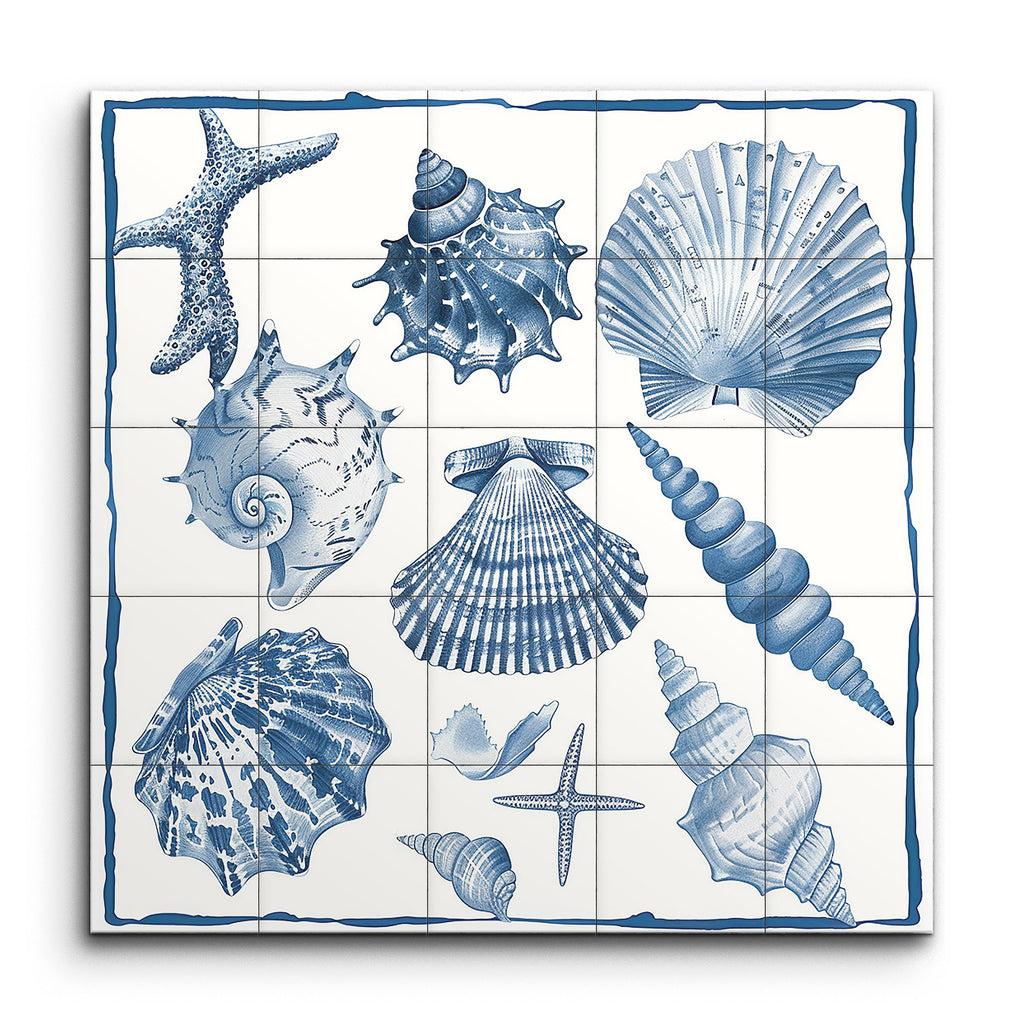 Immerse yourself in the serene beauty of the ocean with this exquisite tile mural, featuring a meticulously detailed illustration of various seashells and starfish. Reminiscent of traditional scientific illustrations, the artwork showcases a monochromatic palette in shades of blue, evoking a tranquil marine ambiance. Each shell and starfish is rendered with remarkable precision, highlighting the unique textures and patterns of different species. Perfectly balanced, this piece adds a touch of elegance and educational charm to any space.