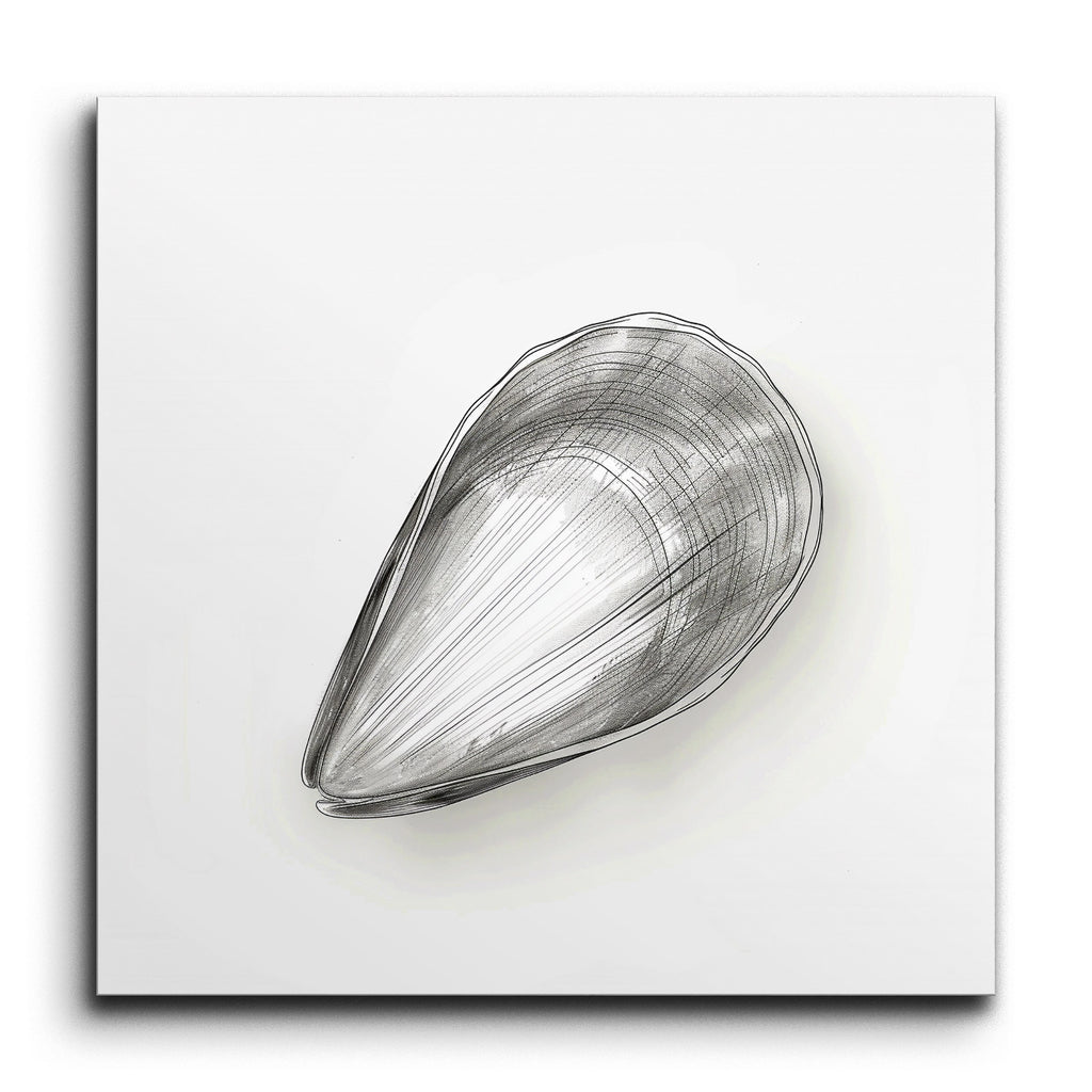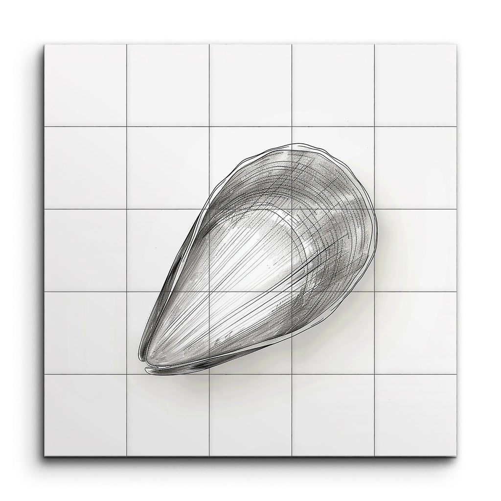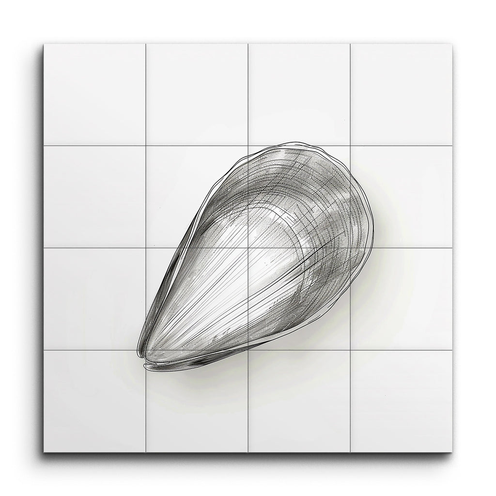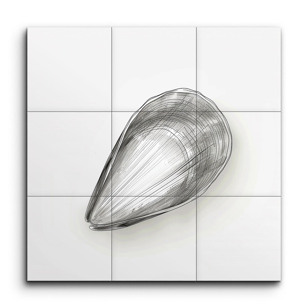 Bring the serene beauty of the ocean into your space with this stunning tile mural, featuring a detailed, monochromatic sketch of a mussel shell. The artist's meticulous line work creates an intricate, three-dimensional appearance, drawing you into the shell's natural elegance. The minimalist, modern style focuses on the shell's form and texture, using fine lines and cross-hatching to evoke depth and volume. This refined composition celebrates the simplicity and grace of nature, making it a timeless addition to any decor.