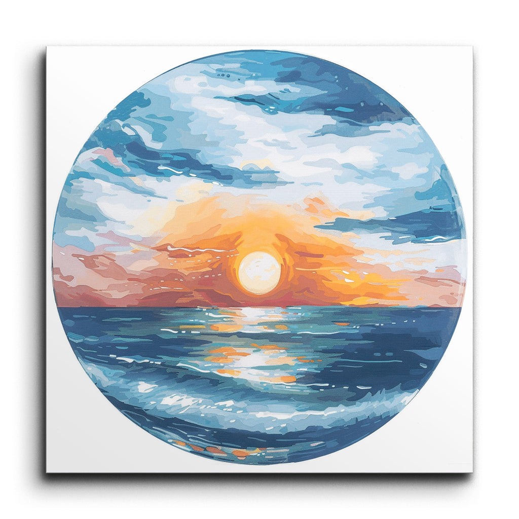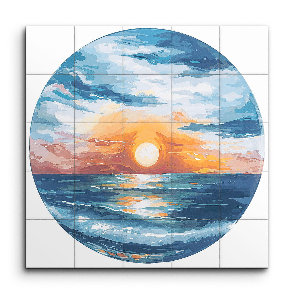 Transform your space with this stunning tile mural, showcasing an impressionistic circular painting of a serene ocean sunset. Loose brushstrokes and a vibrant color palette bring to life a dynamic sky, transitioning from deep blues to warm oranges and pinks as the sun sets on the horizon. The glowing sun casts a warm reflection over the calm, blue ocean, creating gentle waves that mirror the sky's colors. This artwork captures the tranquil beauty of a sunset over the sea, evoking a sense of peace and reflection.