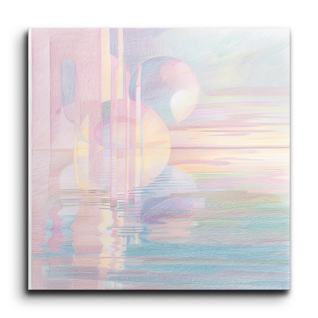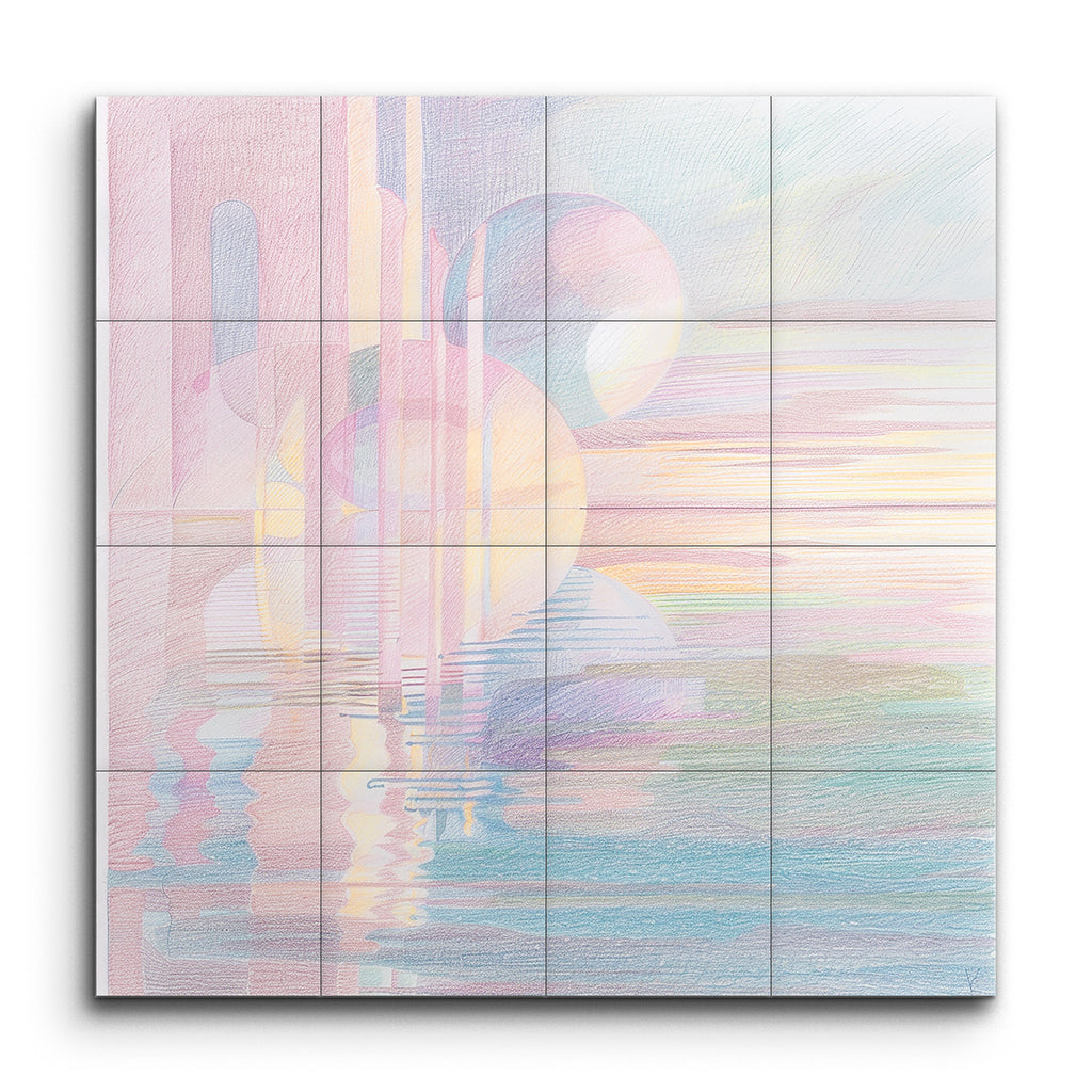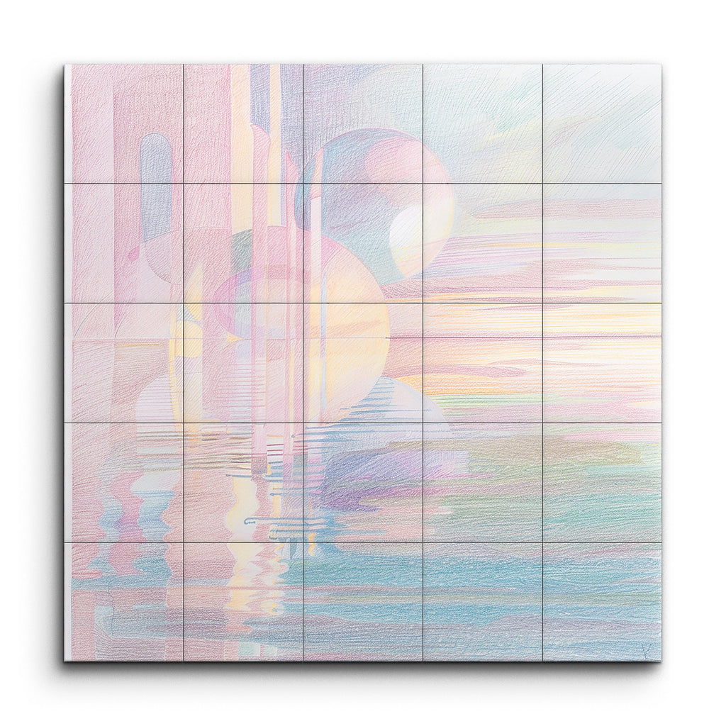 Transform your space with this captivating tile mural, featuring a serene abstract composition in soft pastel hues. Gentle pinks, purples, blues, and yellows blend seamlessly, creating a tranquil atmosphere. Floating spheres and intersecting vertical lines add depth and dimension, while their reflections in a water-like surface evoke a dreamlike quality. Horizontal bands of color suggest a peaceful sunrise or sunset, enhancing the mural's calming and harmonious vibe. Perfect for adding a touch of modern elegance to any room.