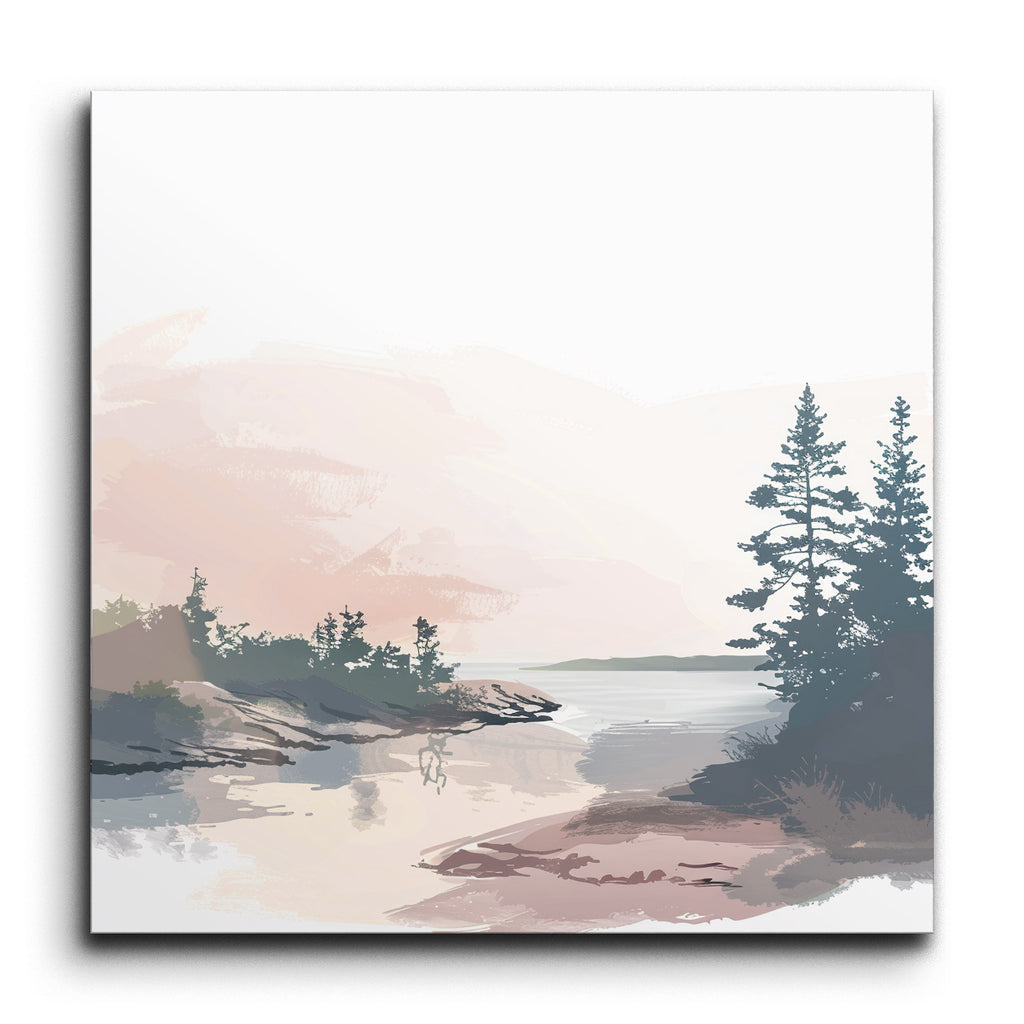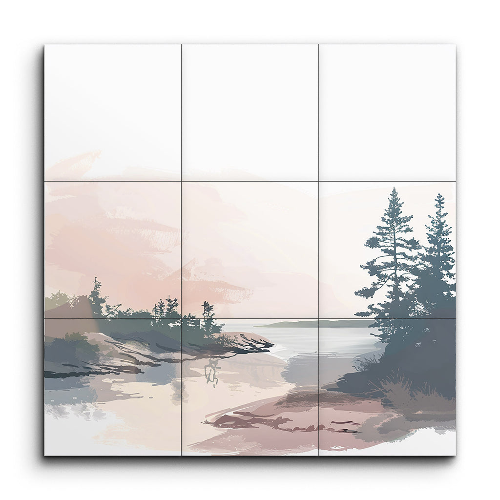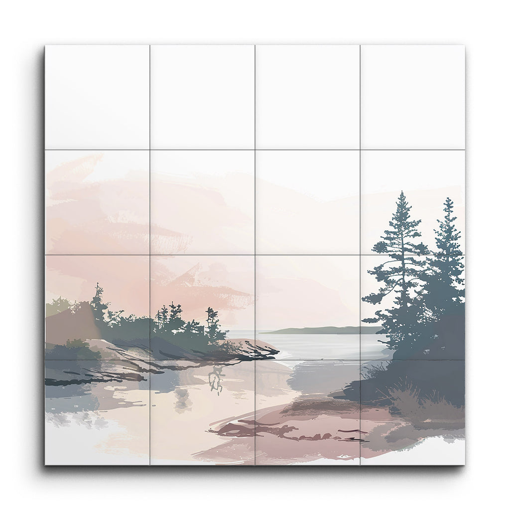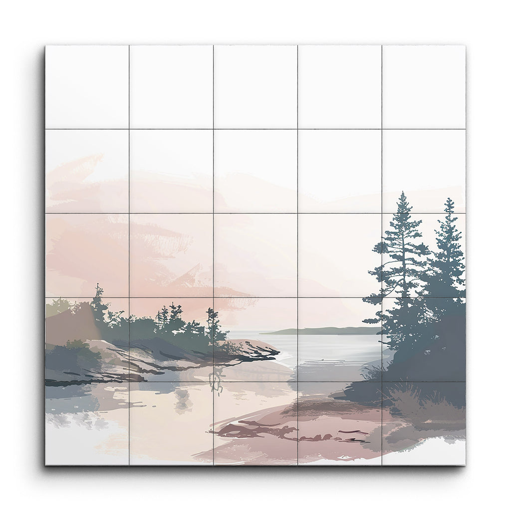 Transform your space with this serene tile mural, capturing the tranquility of a minimalist natural landscape. Soft pastel hues of light pinks, muted greens, and gentle blues portray a calm body of water surrounded by rocky terrain and evergreen trees. The balanced composition features sharply defined tree silhouettes reflected in the still water, while rocky outcrops and smaller trees lead the eye to a misty horizon. This artwork exudes peace and simplicity, offering a soothing ambiance to your home.