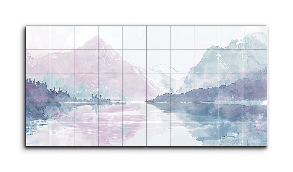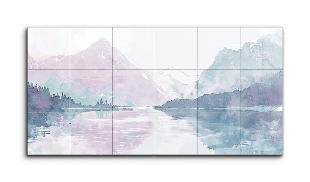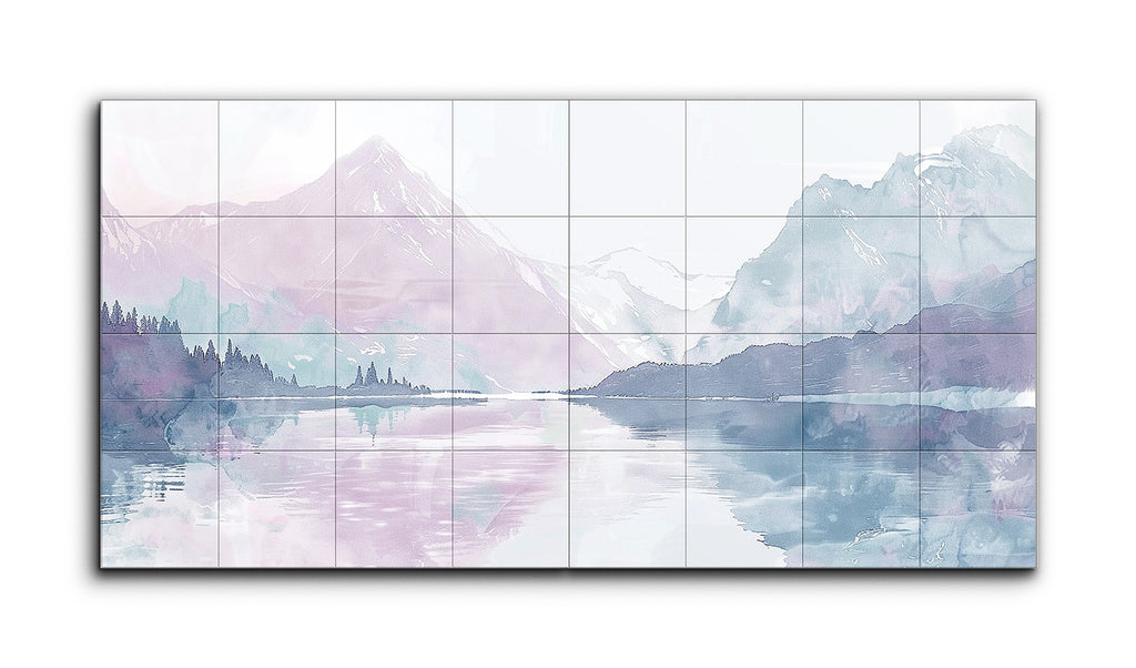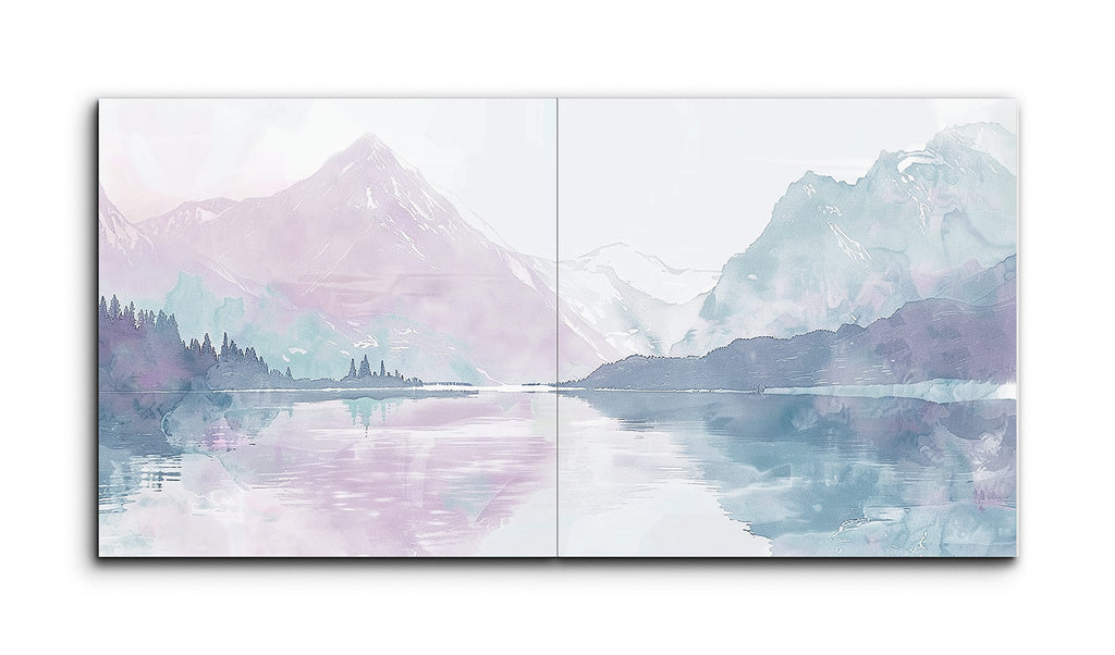 This diptych mural showcases a serene, somewhat abstract landscape of a mountainous region beside a calm lake, rendered in soft pastel hues of pink, purple, and blue. The impressionistic brushwork lends an ethereal quality to the scene, with misty mountains and gently defined trees bathed in the soft light of dawn or dusk. The water's reflection mirrors the tranquil landscape above, creating a symmetrical, peaceful composition that invites contemplation of the unified whole.