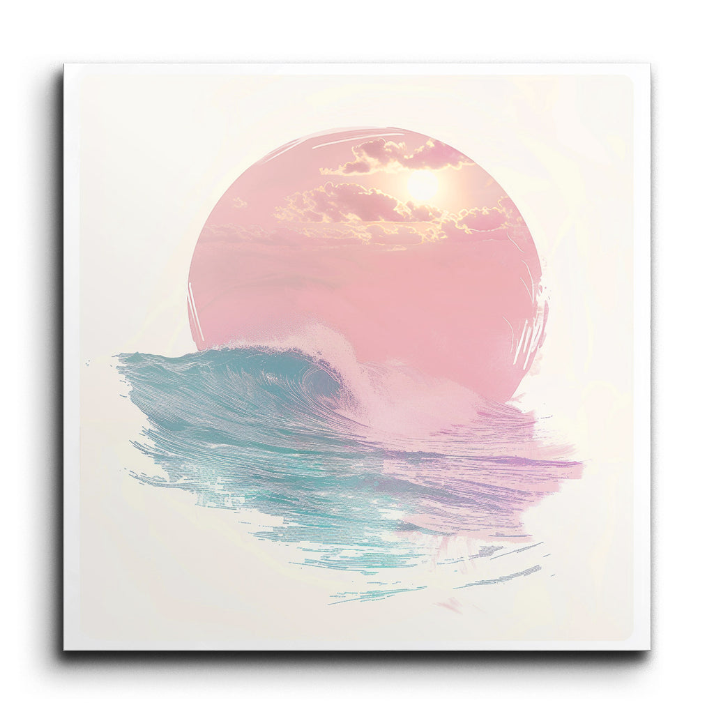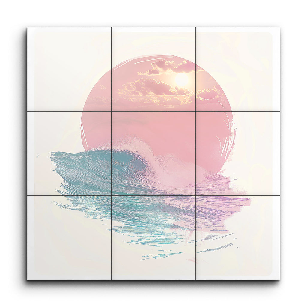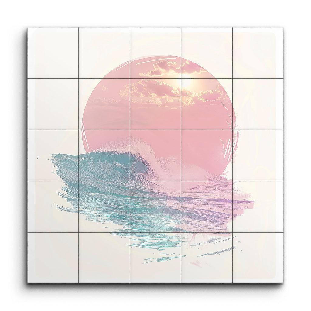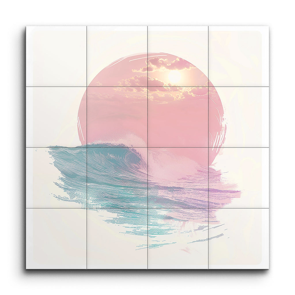 Immerse yourself in serenity with this captivating tile mural, featuring a minimalist and modern depiction of a pastel-colored sun rising or setting over a tranquil ocean wave. Soft shades of pink, peach, and yellow blend seamlessly in the sun, adorned with delicate, wispy clouds that add texture. The stylized wave in cool blues, turquoise, and subtle hints of purple and pink mirrors the sun's hues, creating a fluid, ethereal quality. The dreamy gradients and fine lines evoke a peaceful, harmonious atmosphere.