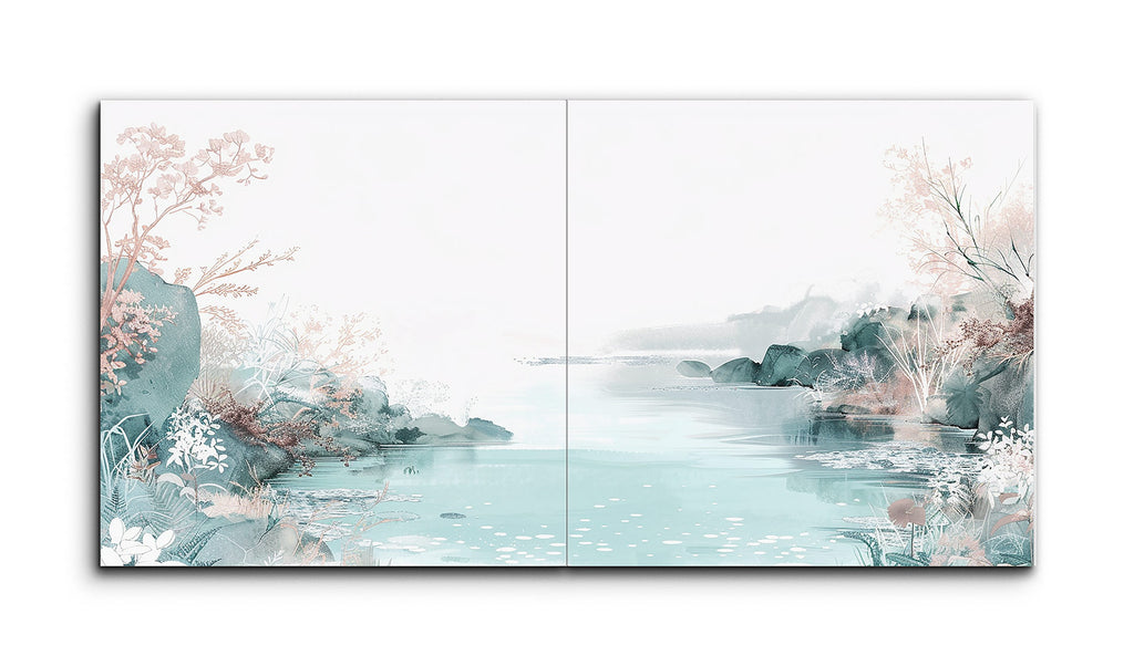 This diptych artwork showcases a serene natural landscape, reminiscent of East Asian ink wash paintings. The tranquil scene, rendered in soft pastels of pale blue, mint green, white, and hints of pink and coral, depicts a calm waterscape with gentle ripples. The composition features balanced flora on both panels: a large, rounded hill adorned with delicate flowering plants on the left, and more vegetation and rocks on the right. Loose, expressive brushwork and strategic negative space create depth and a misty, contemplative atmosphere.