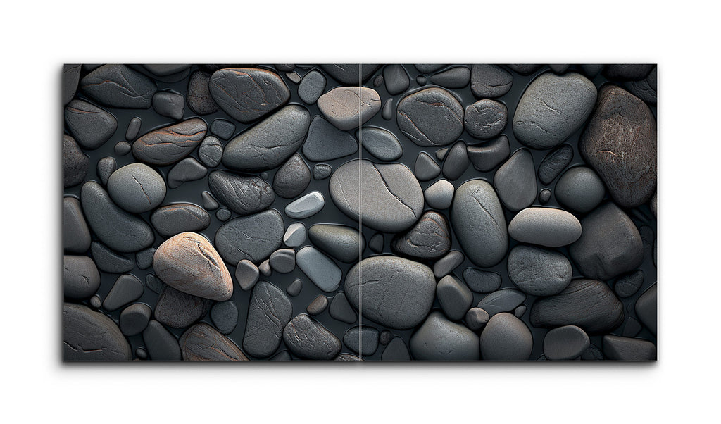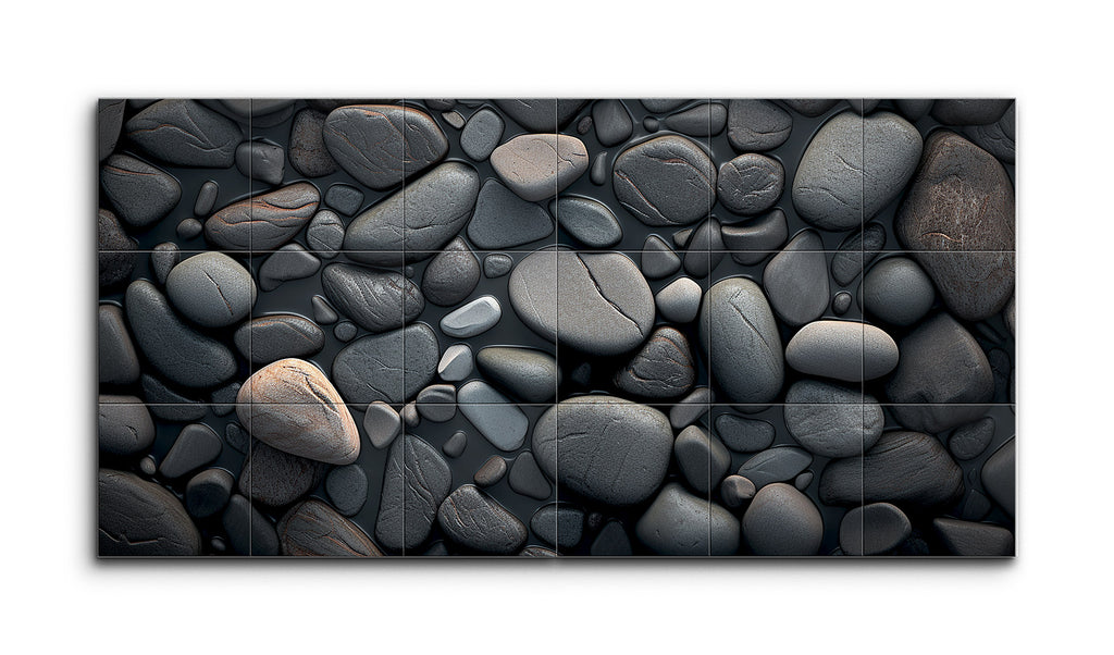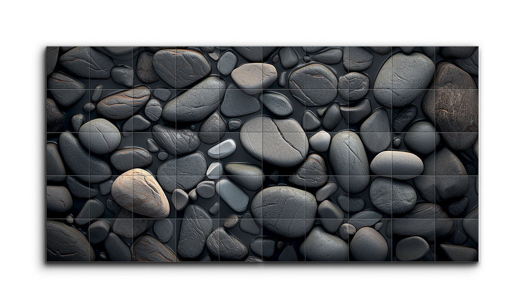 This tile mural artwork presents a meticulously detailed collection of pebbles, varying in shapes and sizes, tightly assembled to fill the entire frame. The stones, ranging from small and rounded to larger and more oblong, exhibit smooth surfaces indicative of natural wear and polish, possibly by water. The muted color palette—comprising greys, blue-greys, and subtle browns and beiges—imbues a serene and natural ambiance. Soft lighting from the upper left casts gentle shadows, enhancing the three-dimensional realism and tactile texture of the stones. The piece captures the tranquil beauty of nature's simplicity with a focus on texture and natural elements.
