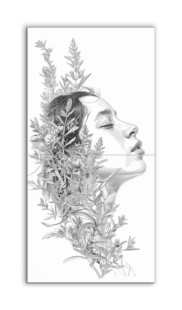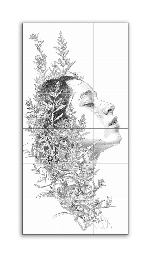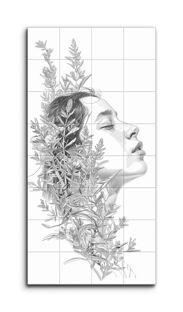This tile mural features a finely detailed illustration of a woman's profile, facing right with closed eyes and slightly parted lips, evoking serenity. Her face is rendered in precise lines, highlighting the contours and textures. Intricate botanical elements emerge from her hair and neck, seamlessly blending with her form. The monochromatic palette in shades of gray adds depth and an ethereal quality, reminiscent of elegant pencil or ink drawings, creating a harmonious fusion of human and nature.
