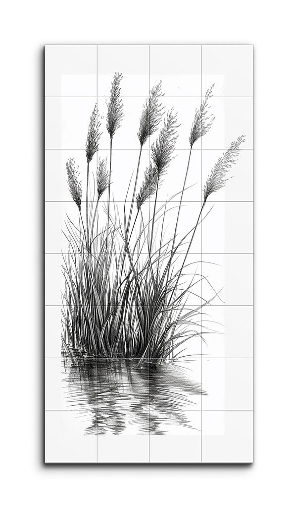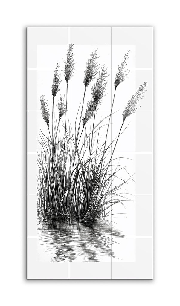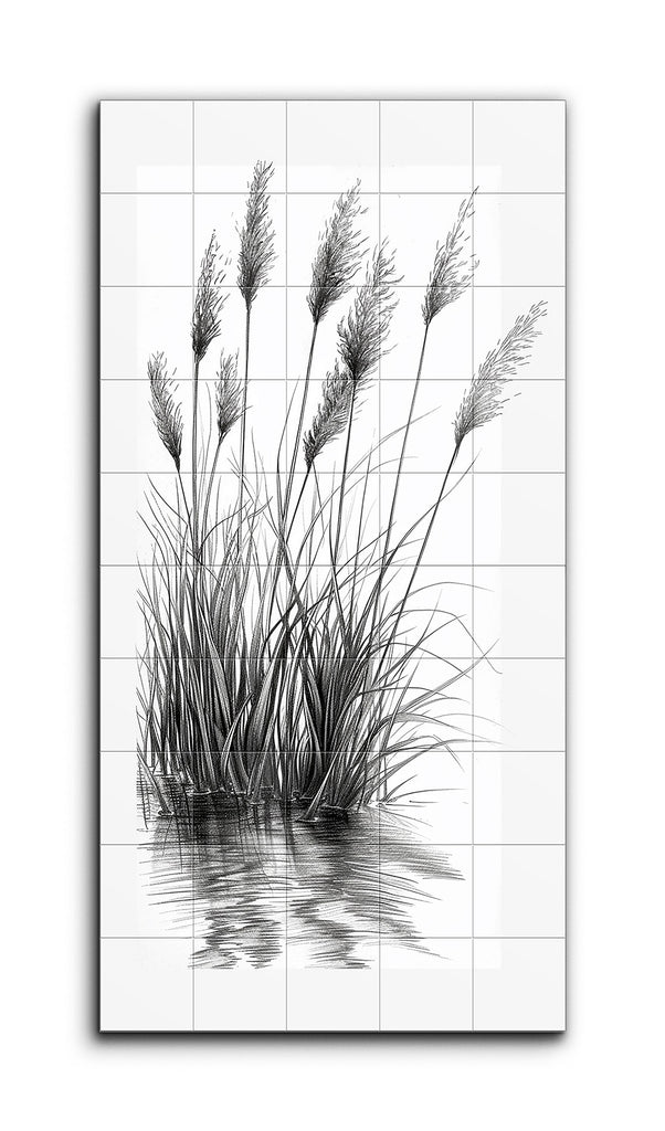 This tile mural features a serene depiction of tall, slender reeds or grasses growing by a tranquil body of water. The monochromatic artwork, rendered in black ink on a white background, exudes elegance through its intricate line work. The detailed strokes create texture and depth, capturing the reeds' gentle sway in the breeze. Their reflections, skillfully illustrated with delicate horizontal lines, suggest ripples on the calm water's surface. The balanced composition and naturalistic quality evoke a peaceful outdoor scene.