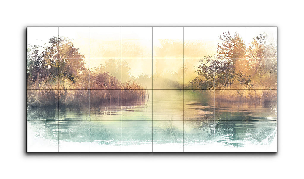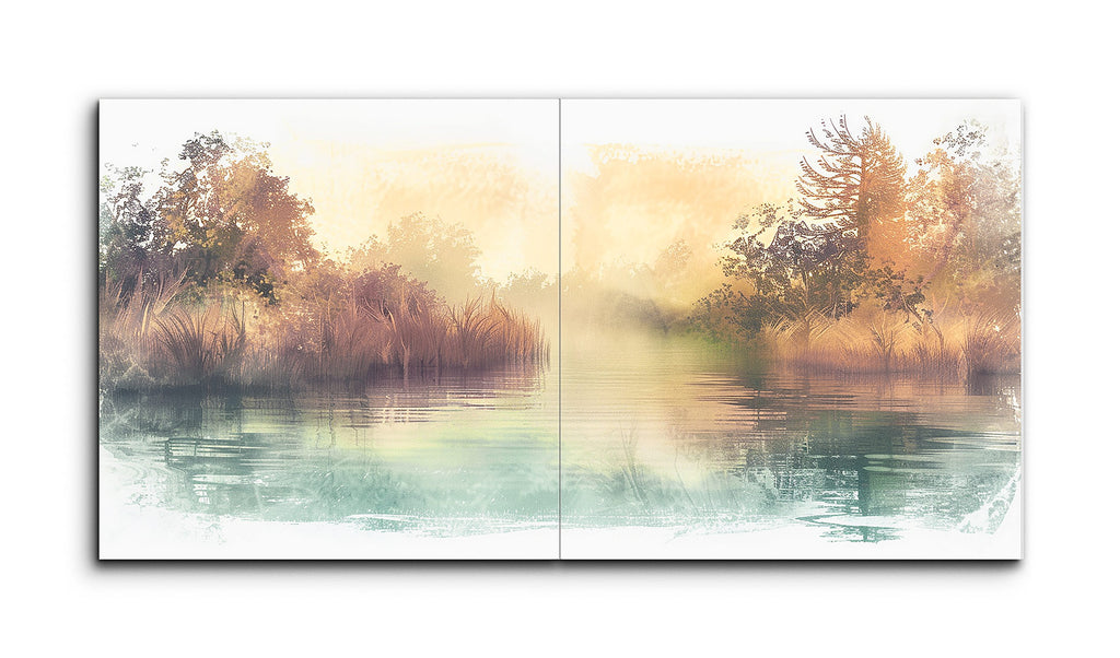 This diptych tile mural presents a serene landscape of a river or lake bordered by dense foliage and trees. The scene is rendered in a dreamy, ethereal style using soft brushstrokes and a muted, pastel color palette of greens, blues, and warm golden hues. Combining elements of impressionism and digital art, the mural captures an atmospheric light and tranquil reflections on the water, evoking a sense of calm and gentle movement in nature. Ideal for spaces that invite relaxation and contemplation.