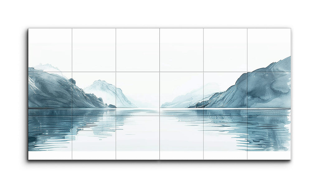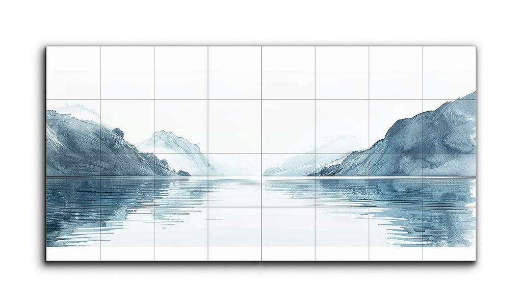 This tile mural showcases a serene landscape divided into two panels, featuring a tranquil body of water that reflects the surrounding mountains. Soft, muted blues and whites create a peaceful atmosphere. The mountains, depicted with gentle brushstrokes, have a misty, ethereal quality. Overlapping ranges on the left and right fade into lighter shades, suggesting depth. The minimalist, impressionistic style focuses on mood, with reflections in the water enhancing the tranquility and balance of the scene.