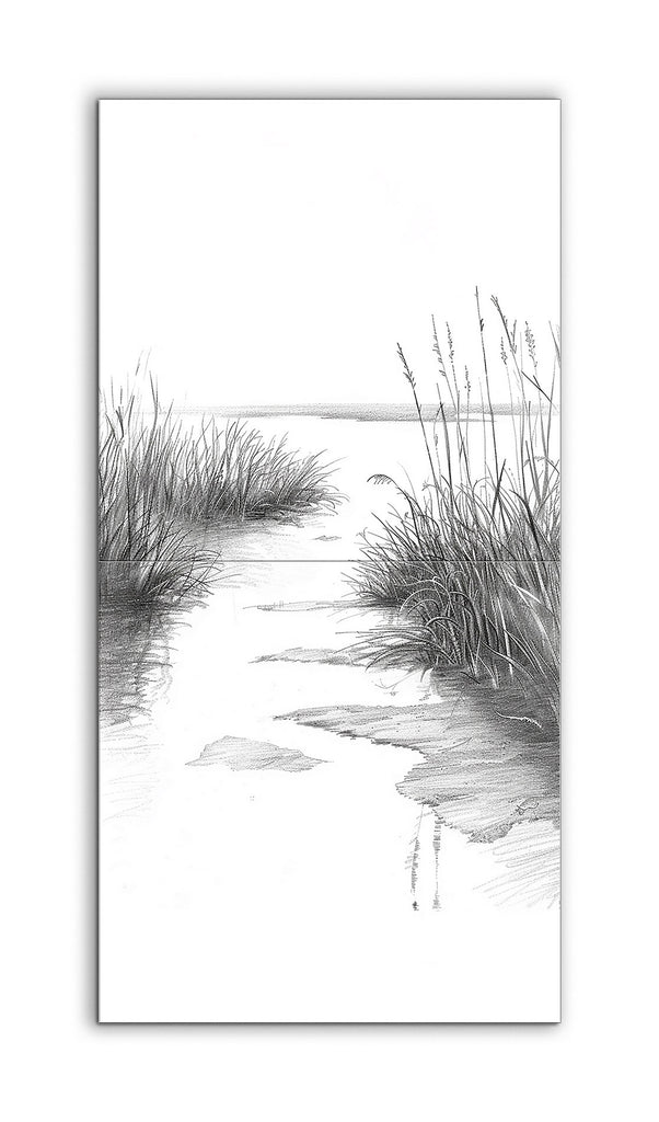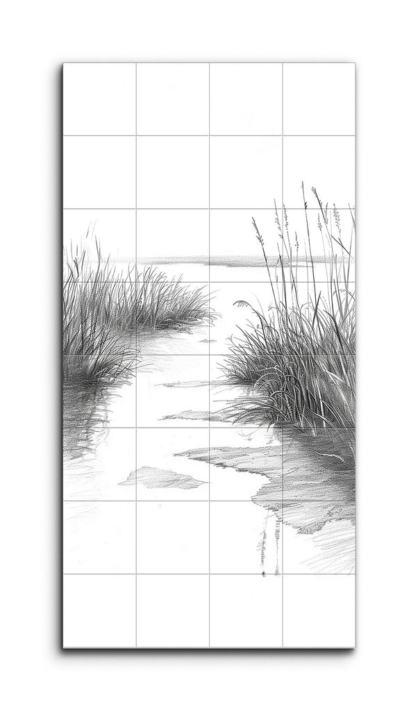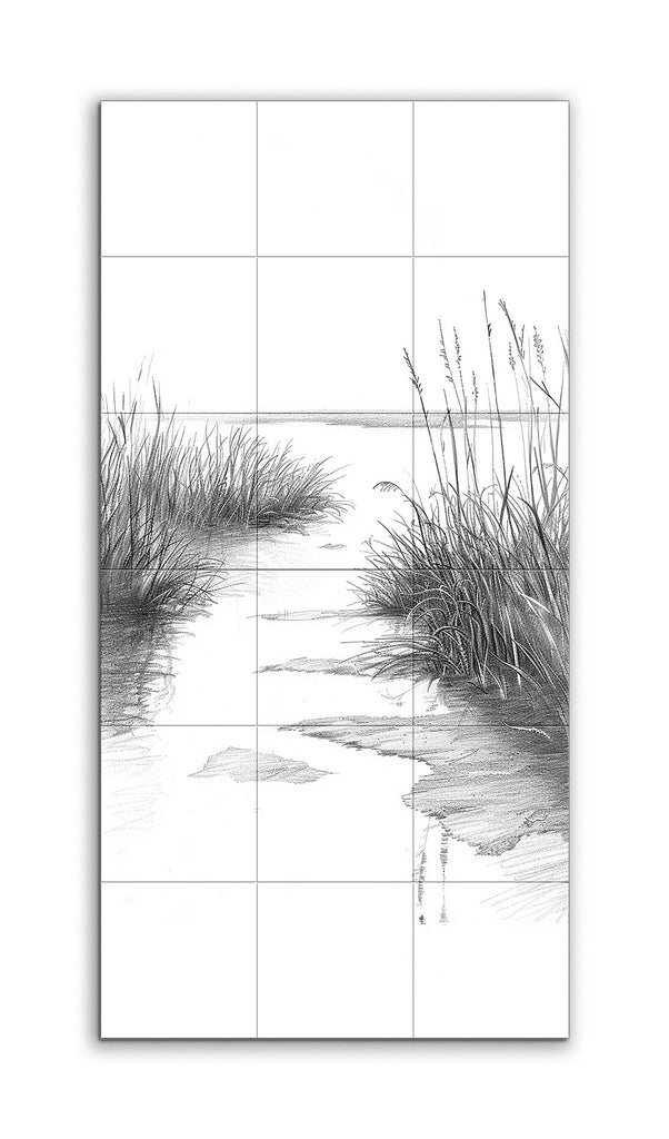 This monochromatic pencil drawing captures a serene natural landscape with exquisite detail. A small lake or pond is framed by tall grasses and reeds, rendered with fine, delicate strokes that evoke a lifelike texture and sense of movement. The calm water, with its subtle reflections and gentle ripples, adds to the tranquility. The mostly blank background enhances the open space and peacefulness of the scene, while the detailed yet simple style underscores the depth and dimension of this tranquil setting.