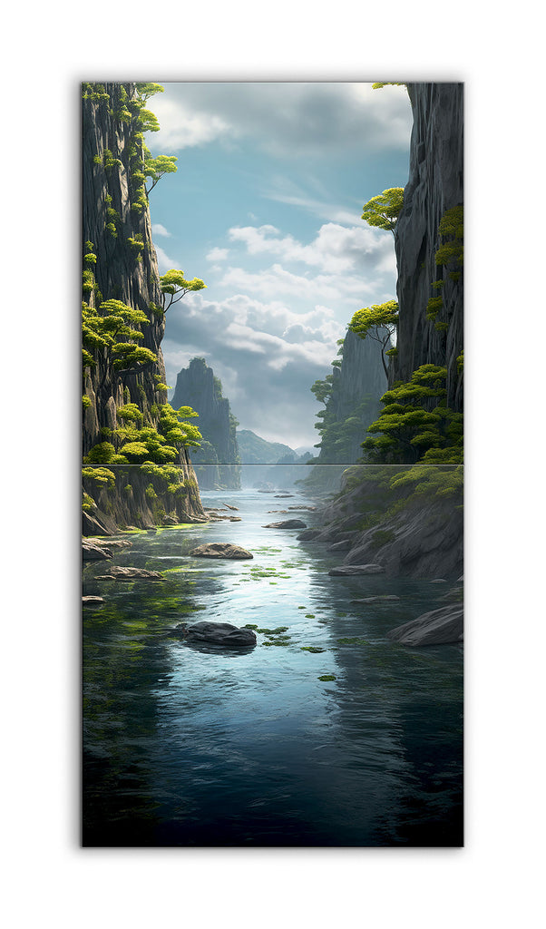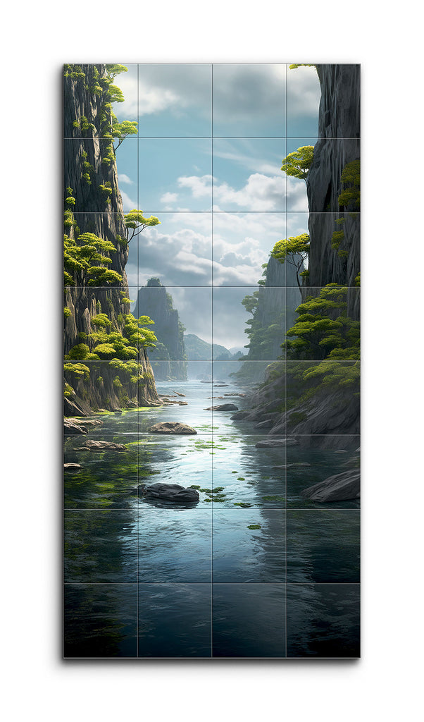 This tile mural portrays a serene landscape with a narrow river flowing between towering cliffs. The cliffs, adorned with lush green vegetation, display various shades of gray and brown, highlighting their rugged texture. The calm, reflective water captures the beauty of the surrounding nature and the bright blue sky above. The detailed, realistic style emphasizes natural elements, with skillful use of light and shadow, creating depth and a tranquil, harmonious atmosphere that draws the viewer's eye to the distant horizon.