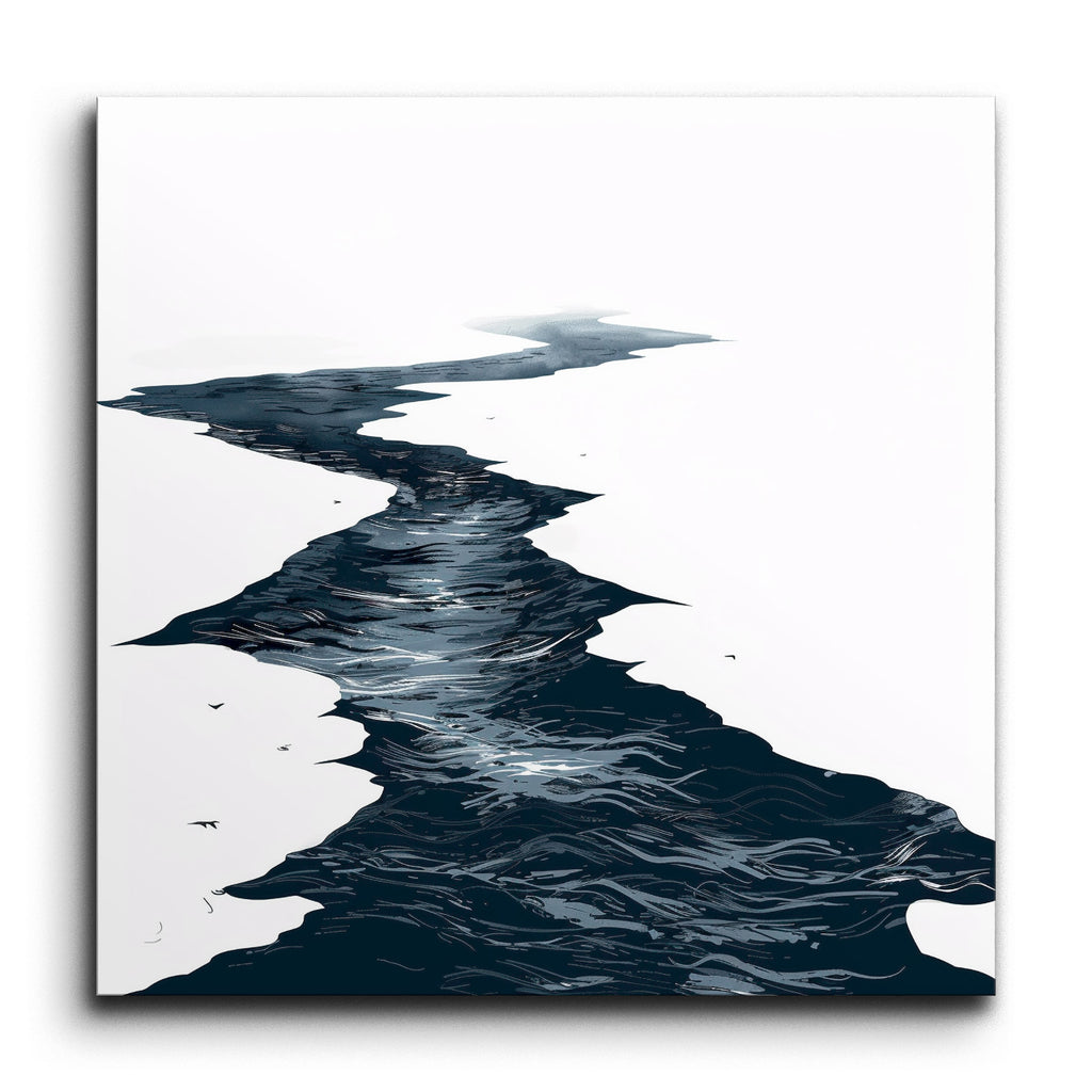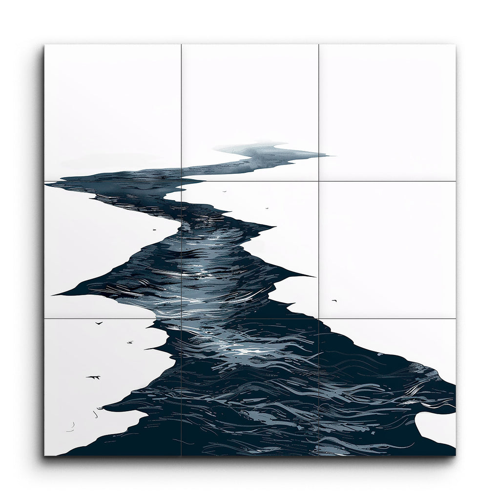 Immerse yourself in the captivating essence of nature with our tile mural, featuring a minimalist artwork of a meandering river cutting through a serene landscape. Deep, dark shades of blue and black depict the flowing current with swirling patterns and ripples, creating a striking contrast against the lighter surroundings. Jagged and irregular edges evoke natural erosion or melting ice, offering a modern, abstract aesthetic that brings a sense of movement and tranquility to any space.