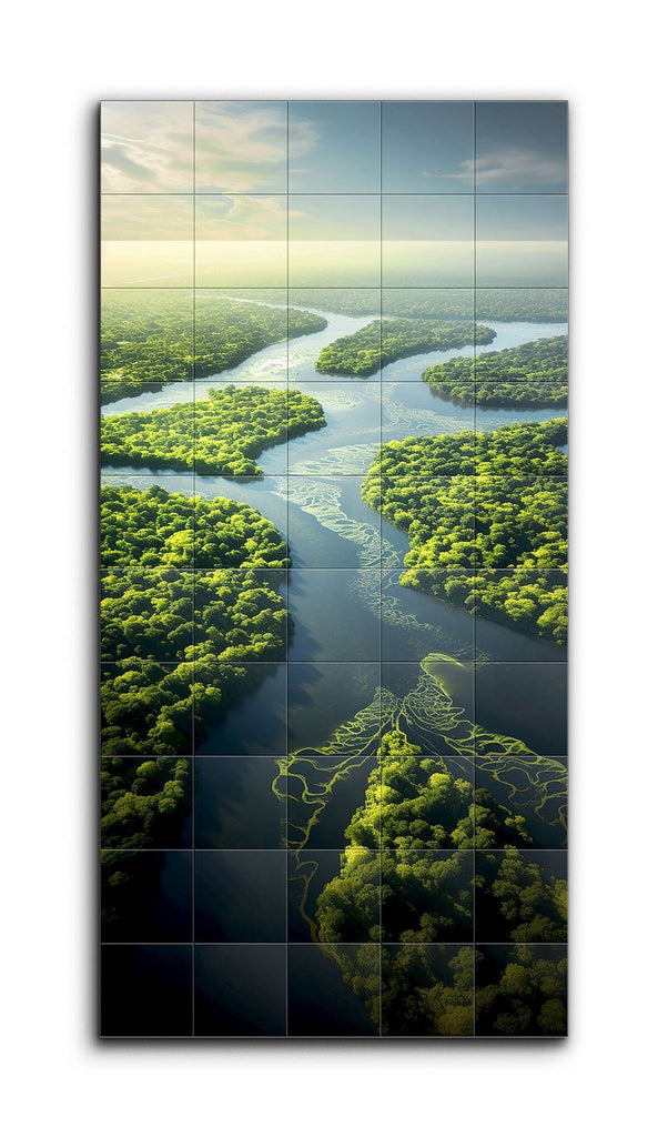 This tile mural presents a stunning aerial perspective of a vast river system weaving through a dense forest. The river meanders, forming islands of lush greenery, with calm, reflective waters showing intricate patterns. The forest, in rich shades of green, is densely packed, creating a thick canopy with occasional clearings. Soft, diffused lighting hints at early morning or late afternoon, with a serene sky adding depth. The highly realistic style and meticulous detail give the scene a lifelike, almost photographic quality.