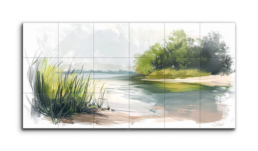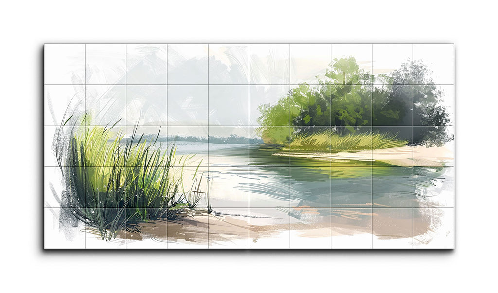 This diptych tile mural captures a serene landscape, likely a riverside or lakeshore, using an impressionistic style. Broad, loose brushstrokes suggest natural forms without precise delineation. In the foreground, lively green and yellow strokes depict sunlit grasses. Soft blue and green horizontal strokes convey calm water. A sandy bank transitions to a vegetative midground. The background features a small island with shadowed trees. Light brushstrokes hint at the sky, emphasizing the peaceful, contemplative scene.