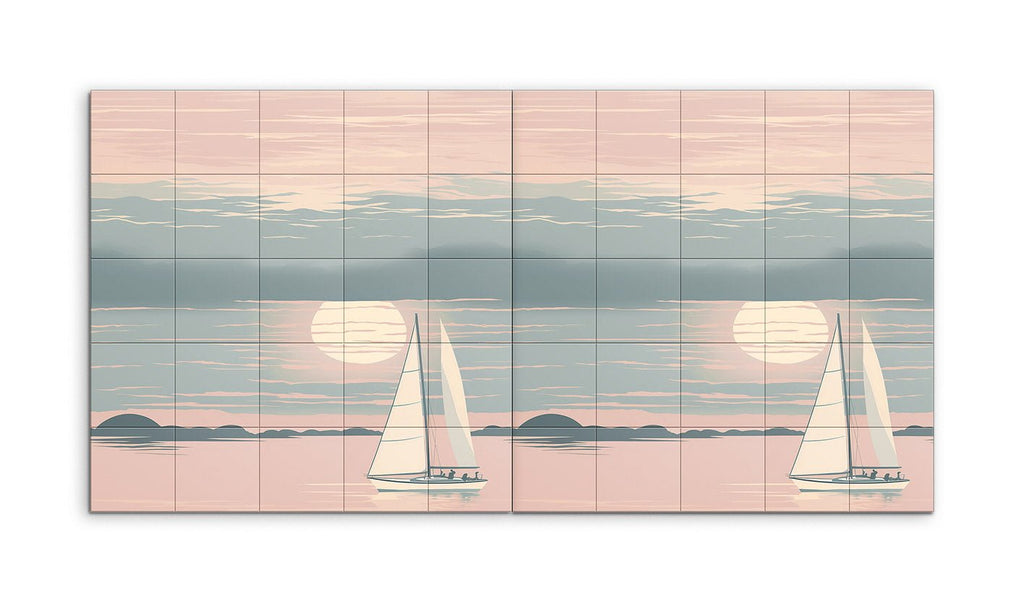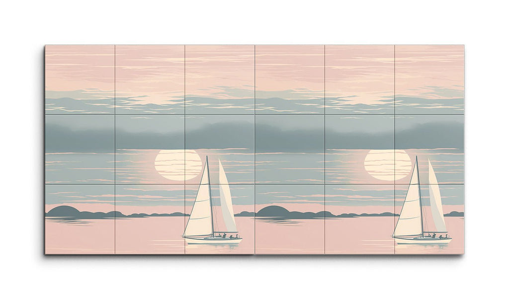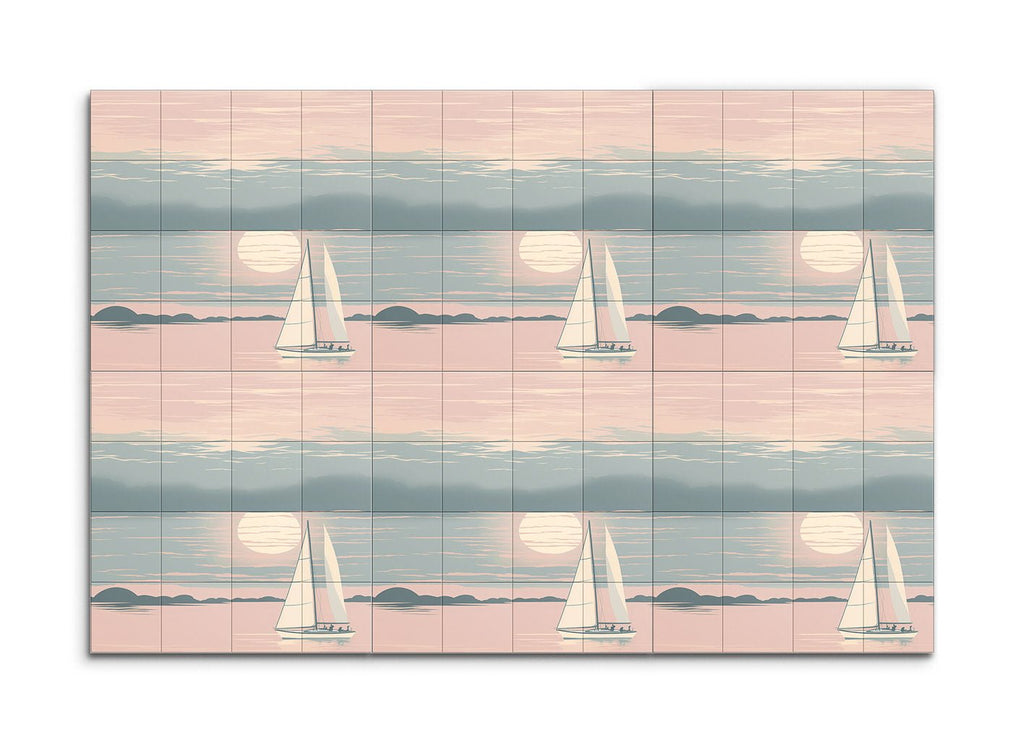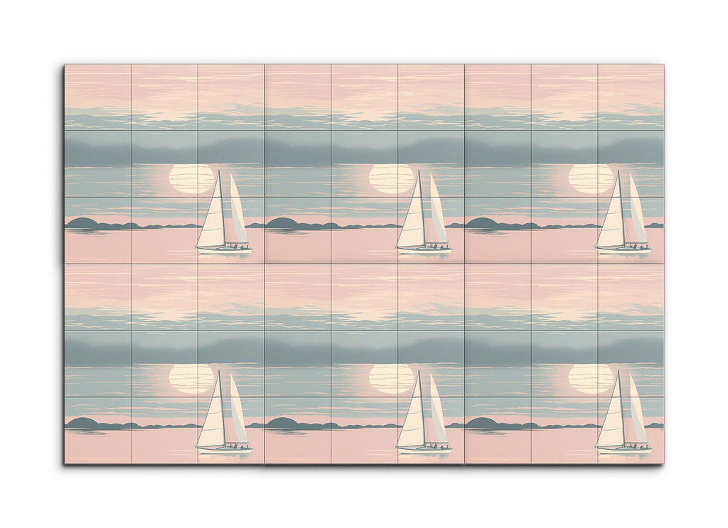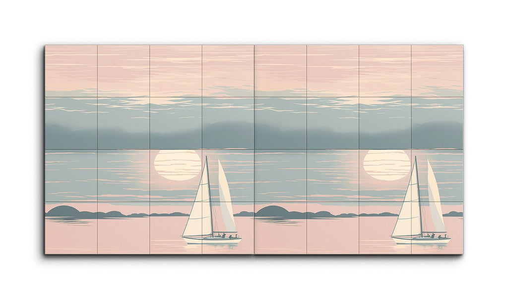 Transform your space with this serene seascape tile mural. A minimalist masterpiece, it captures a sailboat gliding across calm waters under a soft, muted palette of pink, blue, and gray. The sky, with its horizontal streaks of a glowing sunset or sunrise, reflects harmoniously on the water below. Simple, precise lines define the sailboat and its unfurled sails, adding a subtle touch of life. This artwork exudes tranquility and calm, perfect for creating a peaceful atmosphere in any setting.