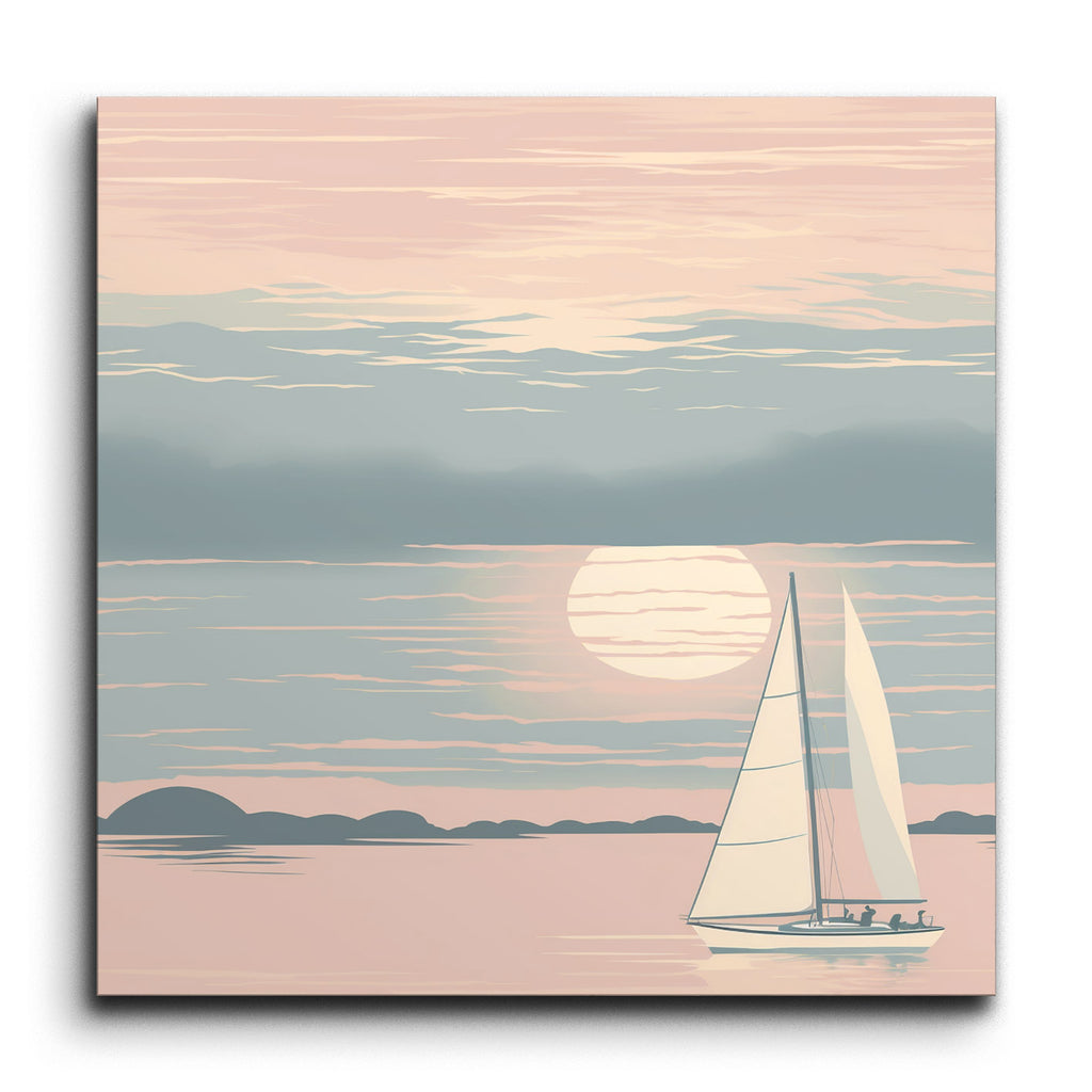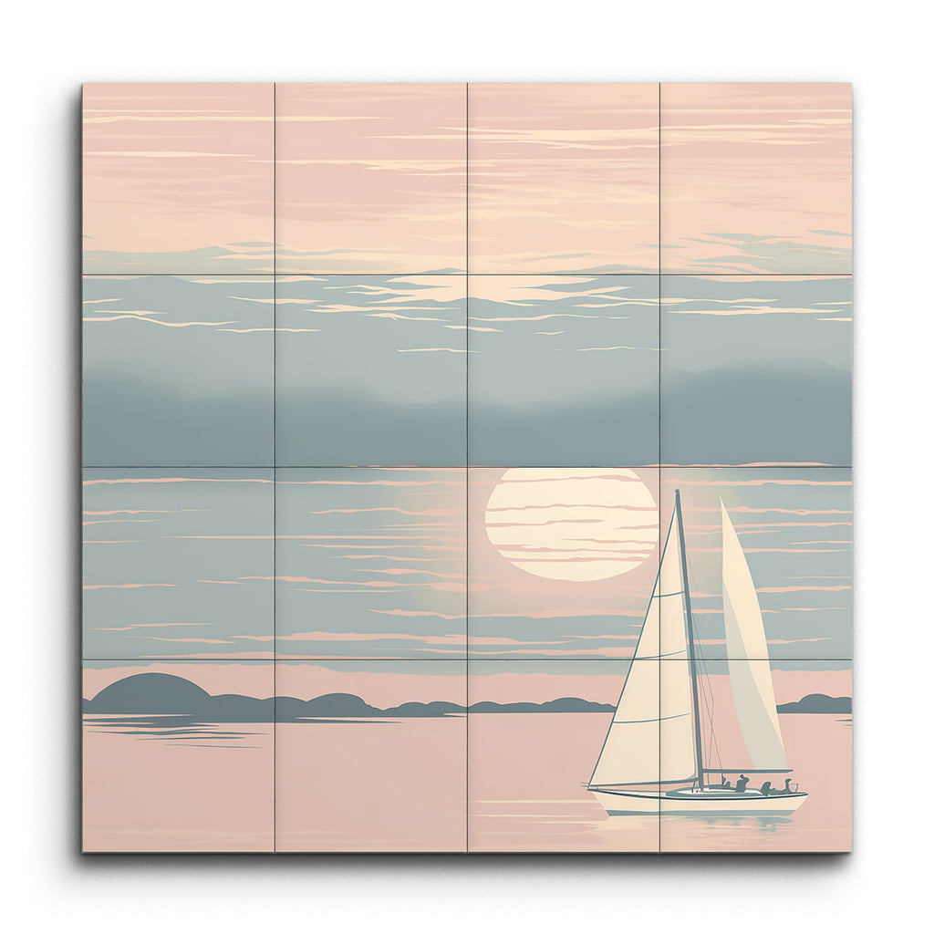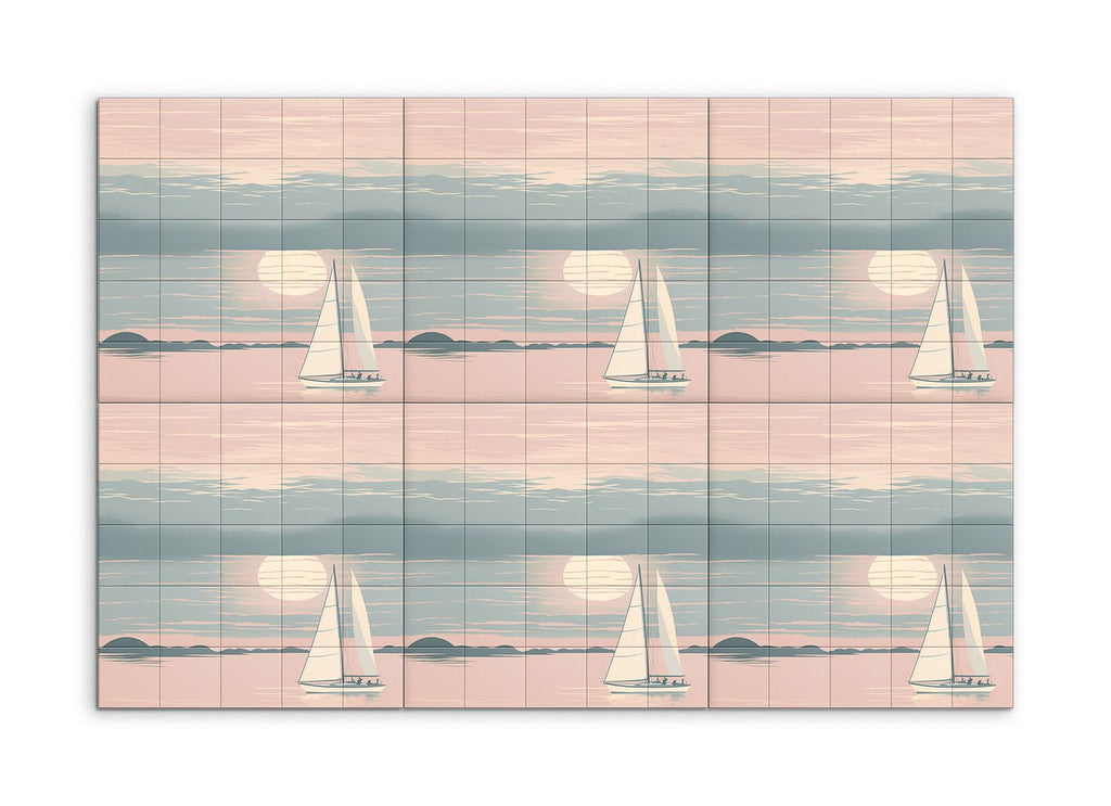 Transform your space with this serene seascape tile mural. A minimalist masterpiece, it captures a sailboat gliding across calm waters under a soft, muted palette of pink, blue, and gray. The sky, with its horizontal streaks of a glowing sunset or sunrise, reflects harmoniously on the water below. Simple, precise lines define the sailboat and its unfurled sails, adding a subtle touch of life. This artwork exudes tranquility and calm, perfect for creating a peaceful atmosphere in any setting.