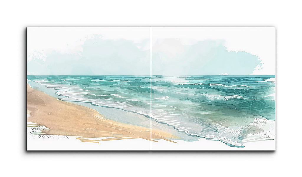 This diptych tile mural captures a serene seascape with a semi-abstract, impressionistic style. Broad, fluid brushstrokes depict the beach and ocean, using soft, muted tones of blues, greens, and sandy beige. The sea shows depth and movement with varying shades, while the beach transitions from beige to frothy white waves. The sky, rendered in pale blues and whites, adds to the tranquil atmosphere, evoking the natural beauty and vastness of a coastal landscape.