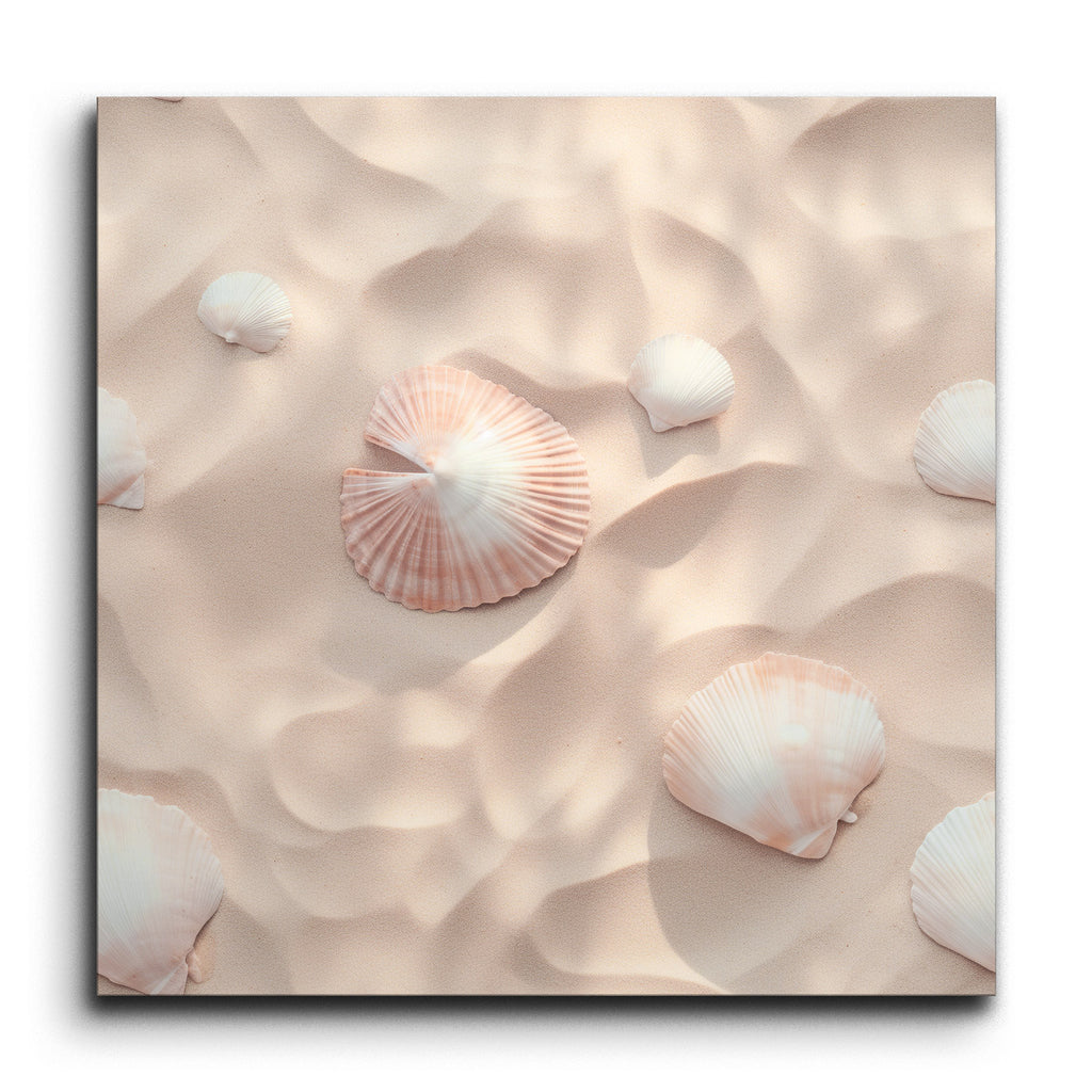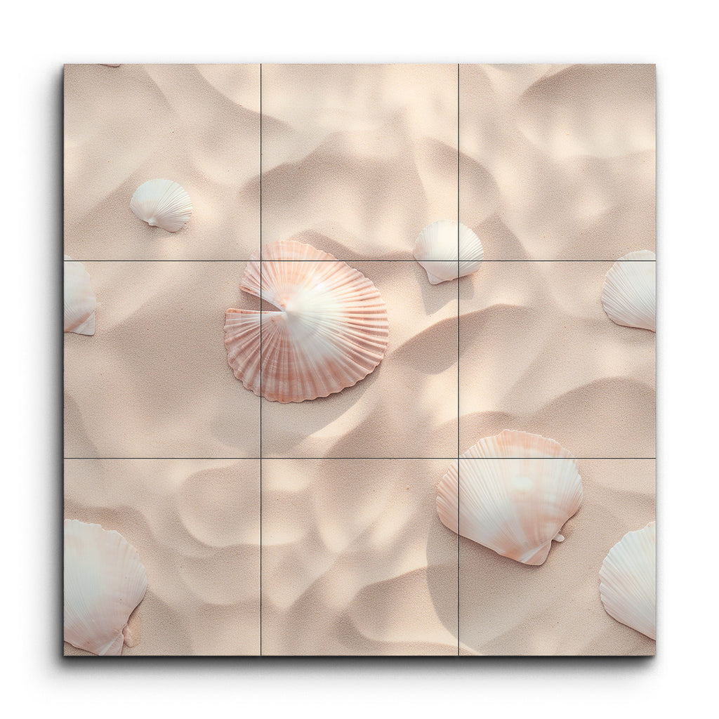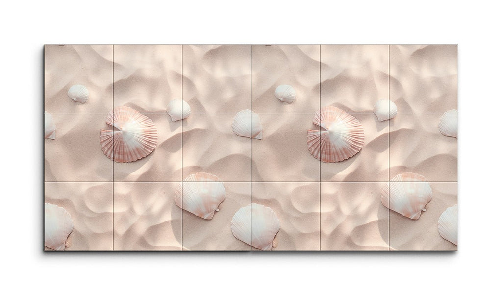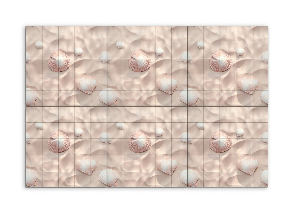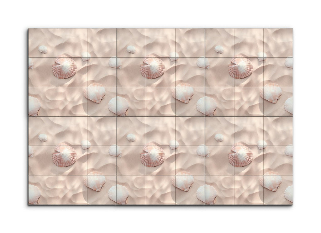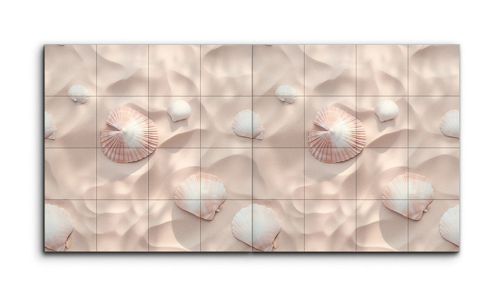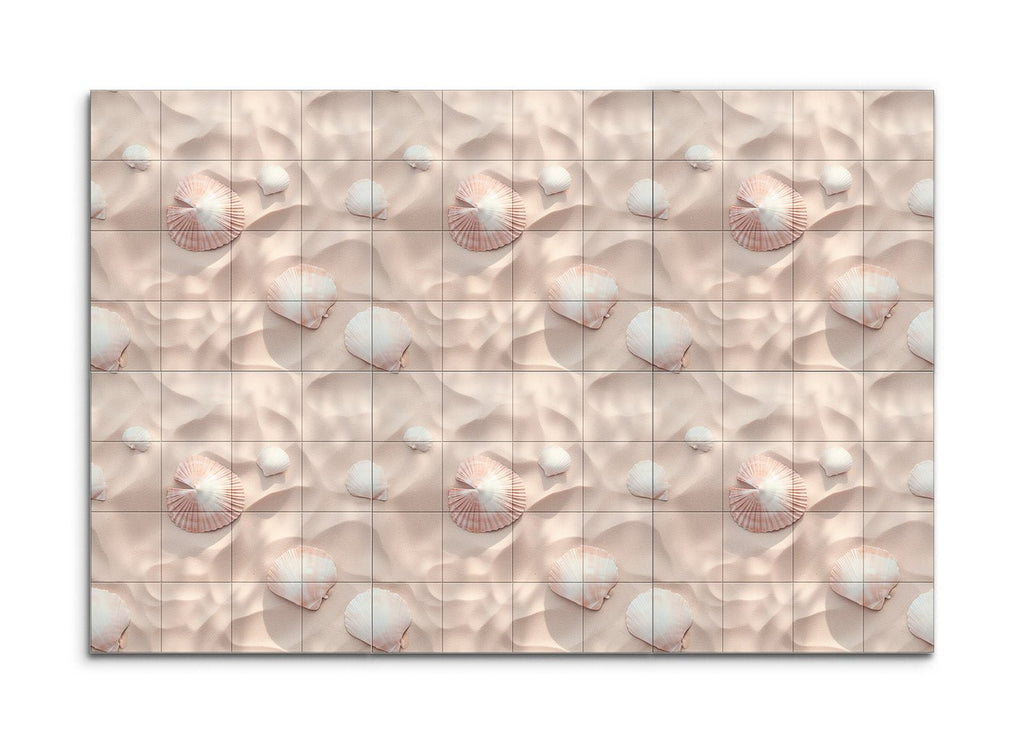 Experience tranquility with our serene tile mural, capturing the essence of a peaceful beach day. This artwork features a minimalistic arrangement of seashells scattered naturally on a sandy surface, creating an organic and calming atmosphere. The soft pastel palette of whites and light pinks, combined with realistic shadows and contours, evokes gentle breezes and ebbing tides. This harmonious composition brings a touch of natural beauty and relaxation to any space, perfect for those seeking a moment of calm.