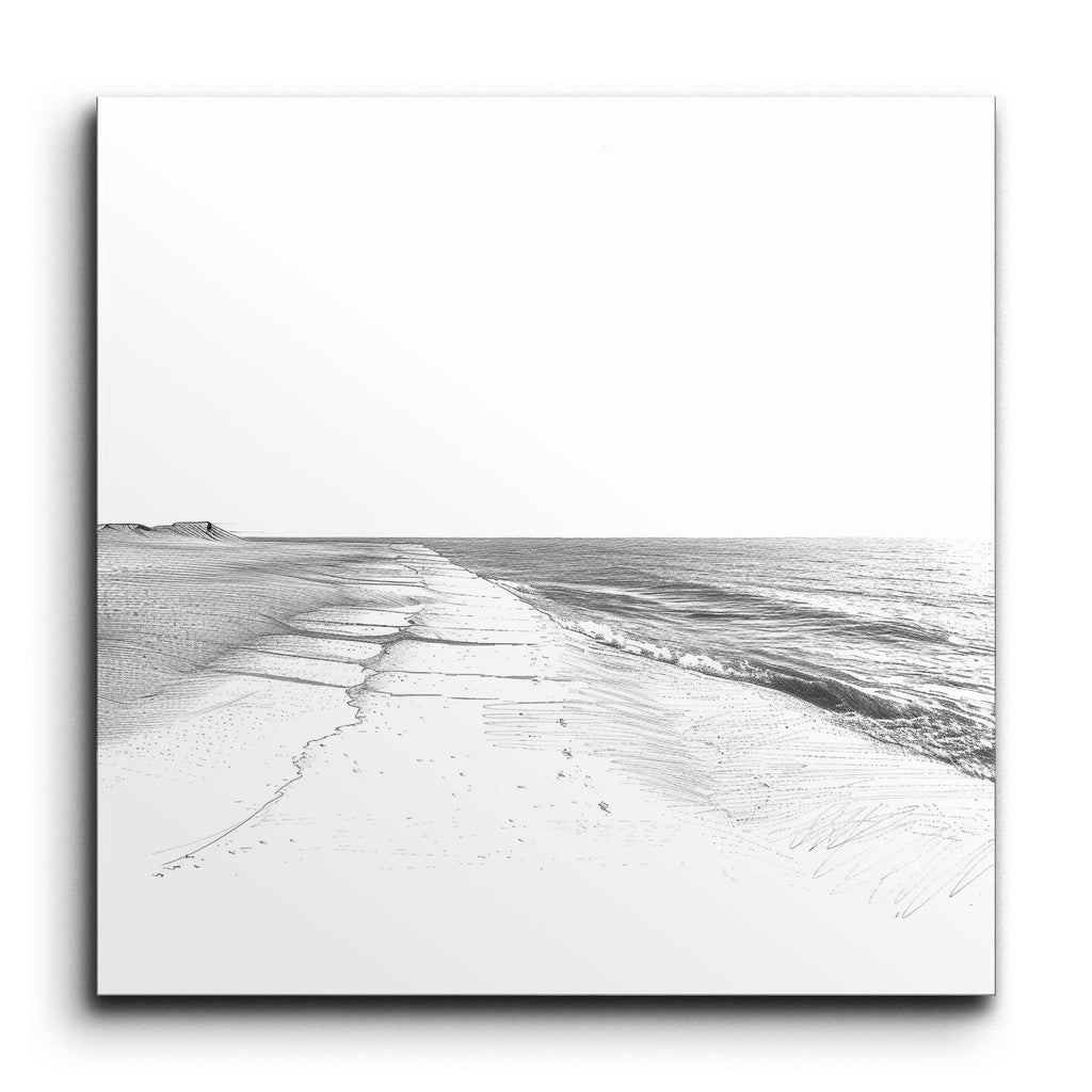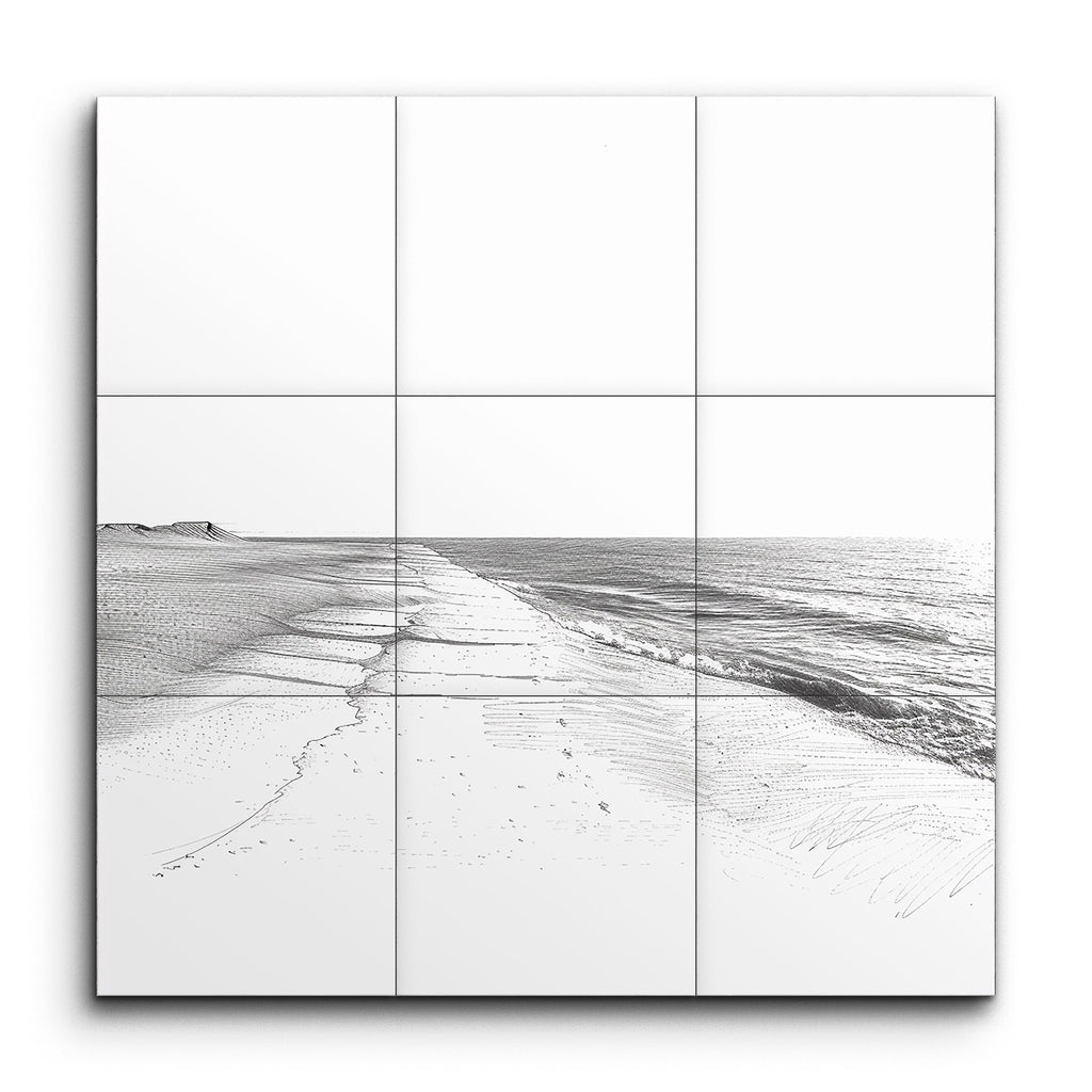 Transform your space with this elegant tile mural, featuring a minimalist black-and-white sketch of a serene beach scene. The artwork captures a long, sandy shoreline extending into the distance, evoking a sense of depth and tranquility. Simple, clean lines depict the texture of the sand and the gentle waves, while a straight horizon emphasizes the vastness of the seascape. This piece brings a calm and tranquil atmosphere, focusing on the essential elements of nature's beauty.