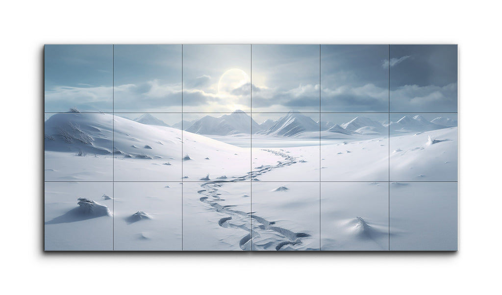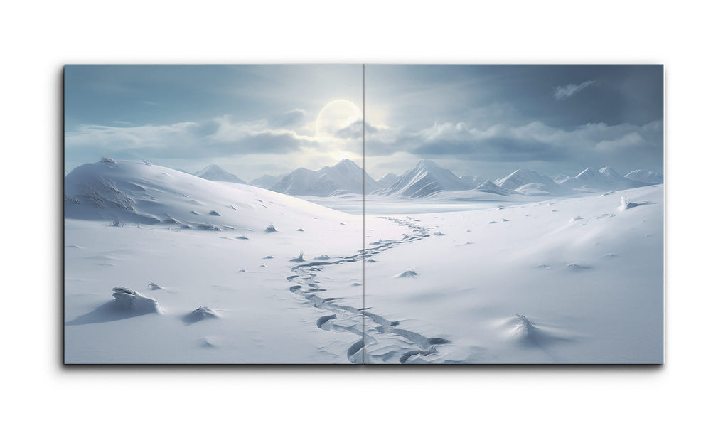 This diptych tile mural captures a serene, snow-covered landscape. Gentle undulations in the foreground snow hint at hidden terrain beneath, while a set of meandering footprints draws the viewer's eye towards the middle distance. The scene transitions to rugged, angular mountains, creating a dramatic backdrop. The overcast sky, with a hazy sun either rising or setting, casts a soft, diffused light, enhancing the tranquil and ethereal quality. The cool tones of blue and white evoke a sense of cold, wintry isolation.