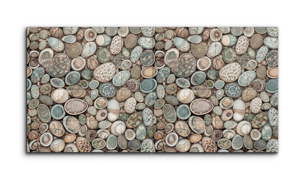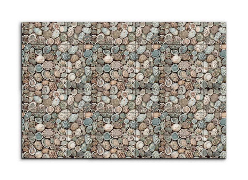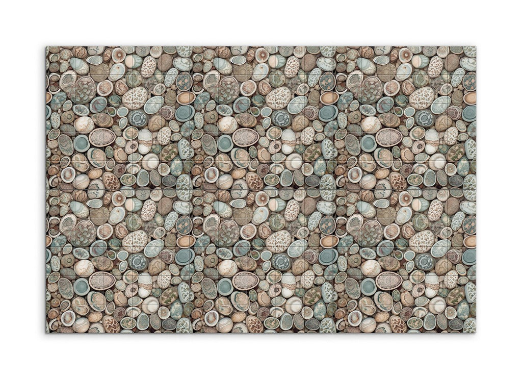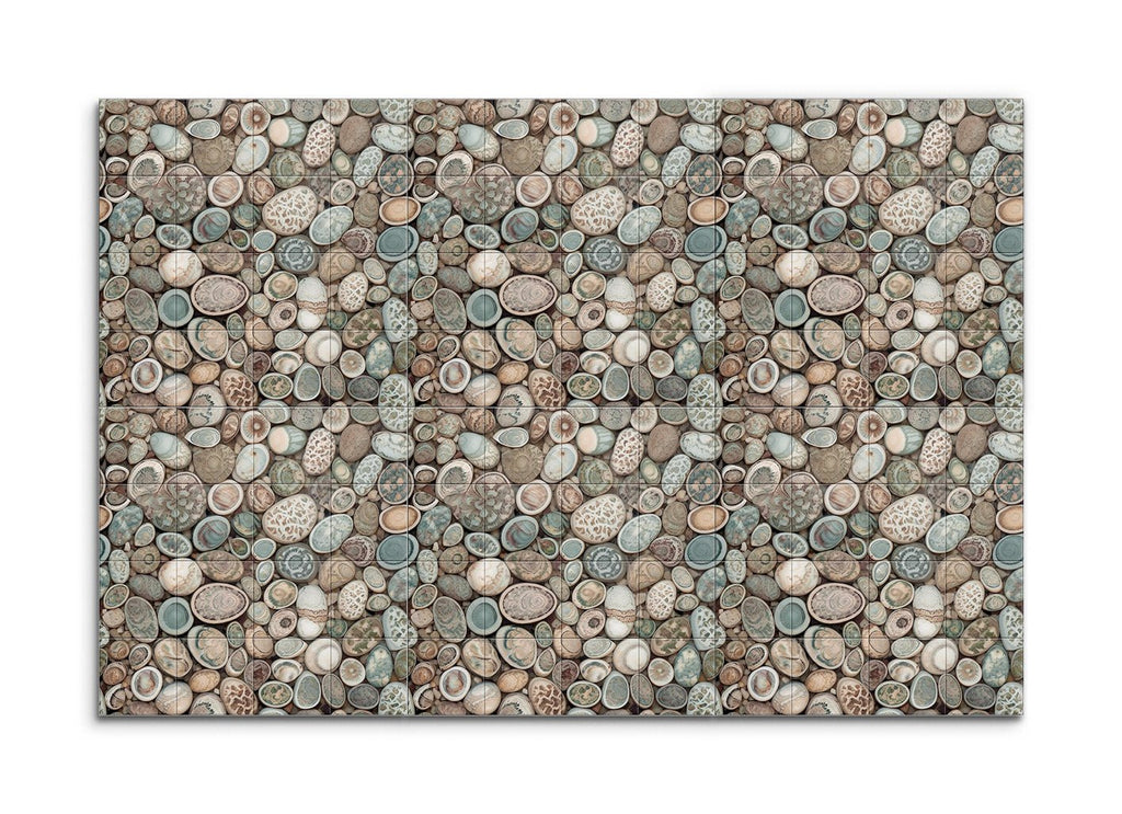 Transform your space with our stunning tile mural, a masterful depiction of intricately detailed stones. Each uniquely textured and colored stone, ranging from earthy browns and beiges to soft greens and blues, is arranged to create a cohesive and visually engaging pattern. The meticulous realism captures the natural beauty and individuality of river rocks or beach pebbles, evoking a serene and timeless quality. This artwork brings a harmonious blend of balance and tranquility to any setting.