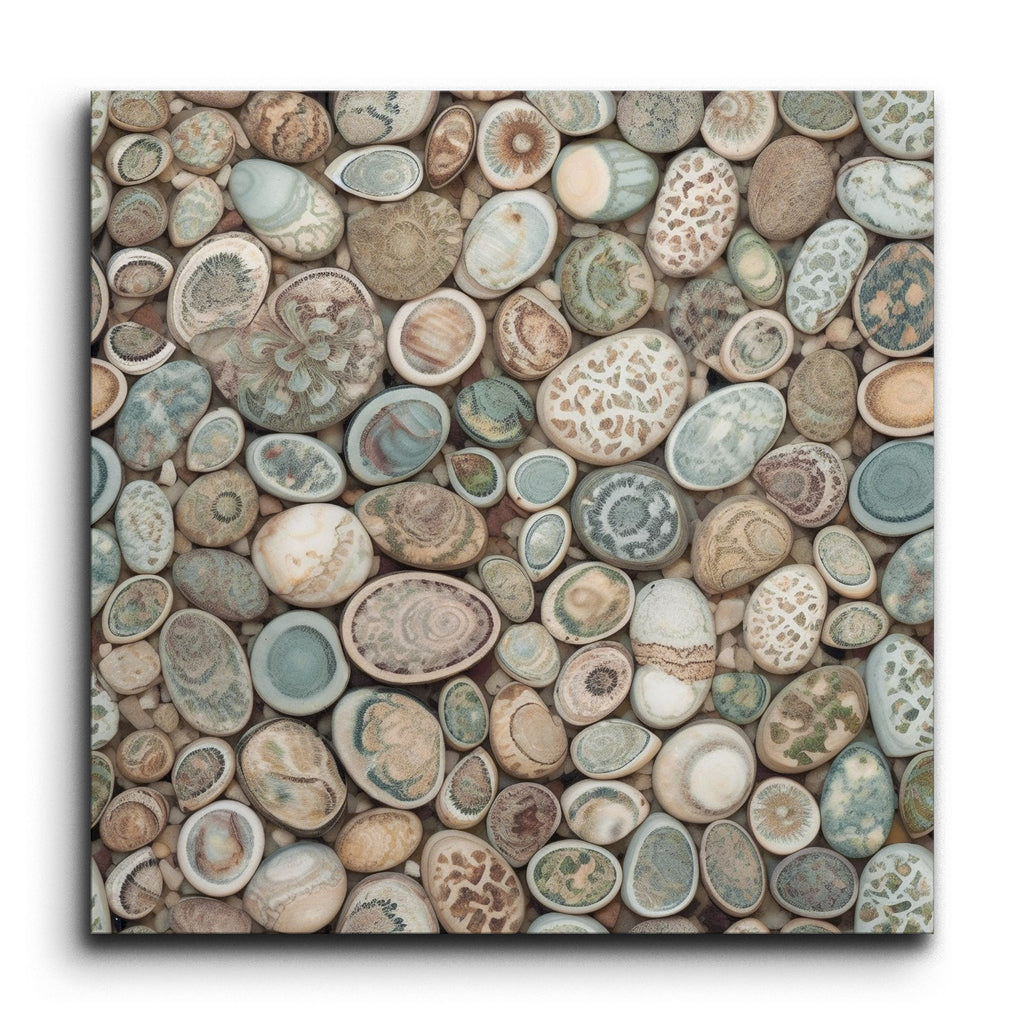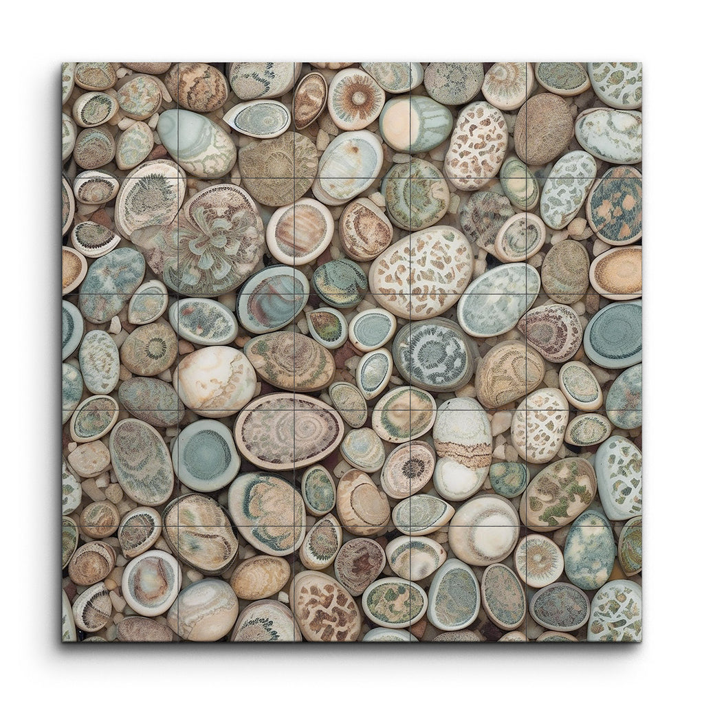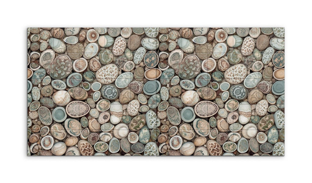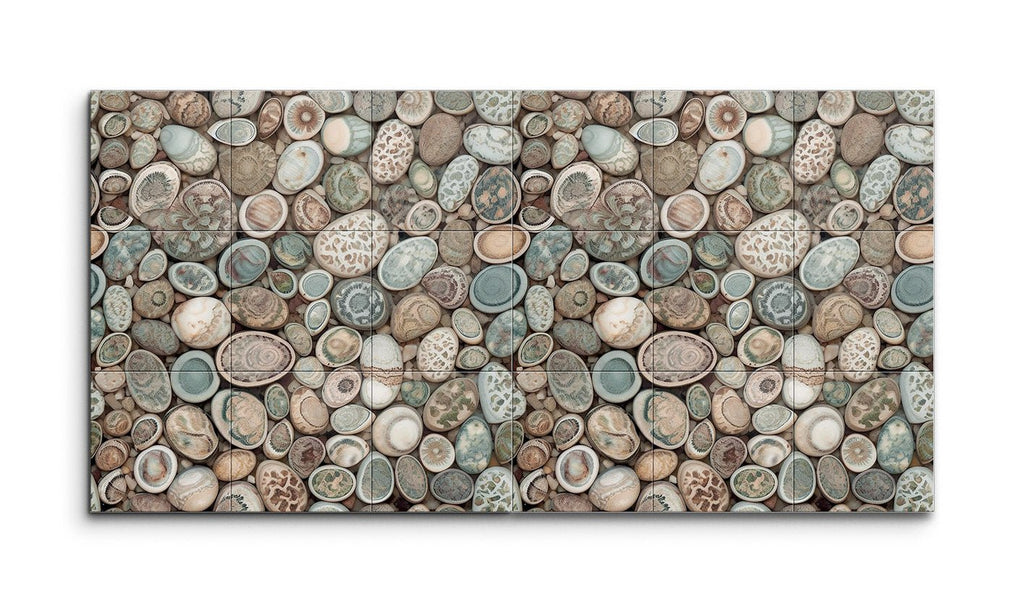 Transform your space with our stunning tile mural, a masterful depiction of intricately detailed stones. Each uniquely textured and colored stone, ranging from earthy browns and beiges to soft greens and blues, is arranged to create a cohesive and visually engaging pattern. The meticulous realism captures the natural beauty and individuality of river rocks or beach pebbles, evoking a serene and timeless quality. This artwork brings a harmonious blend of balance and tranquility to any setting.