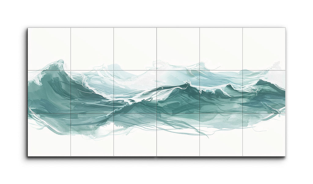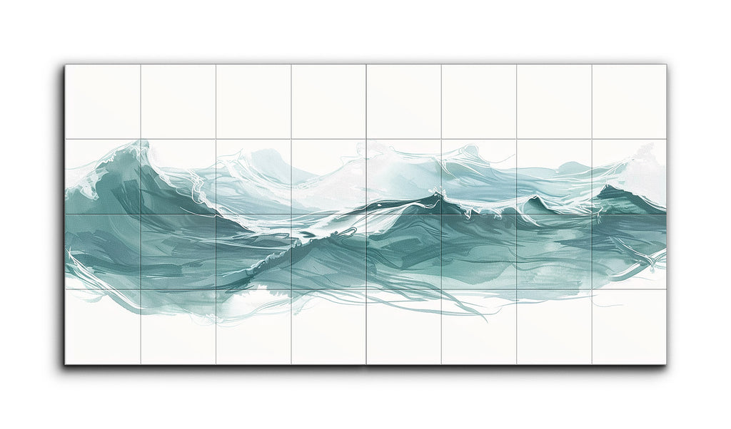 This diptych tile mural presents an abstract seascape, capturing the dynamic forms of waves with sweeping, gestural brushstrokes. The modern, abstract style emphasizes the sea's natural rhythm, using a limited palette of teal shades to evoke a calming, harmonious feel. Soft, flowing lines convey the swirling energy of water, while the interplay of deep and light tones creates depth, highlighting the waves' crests. The composition exudes the serene yet powerful essence of the ocean's ever-changing surface.