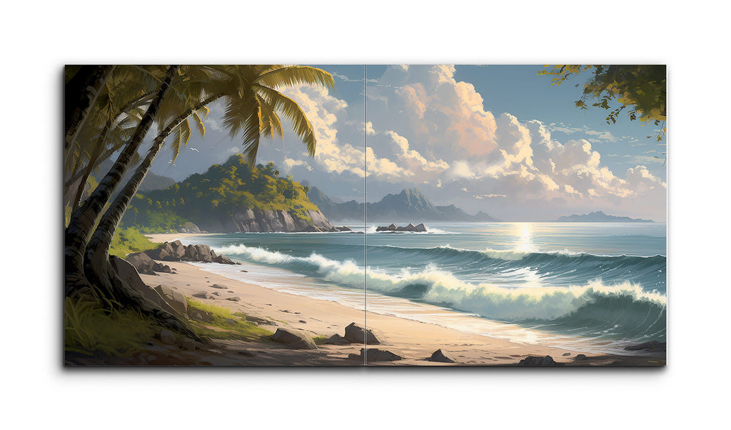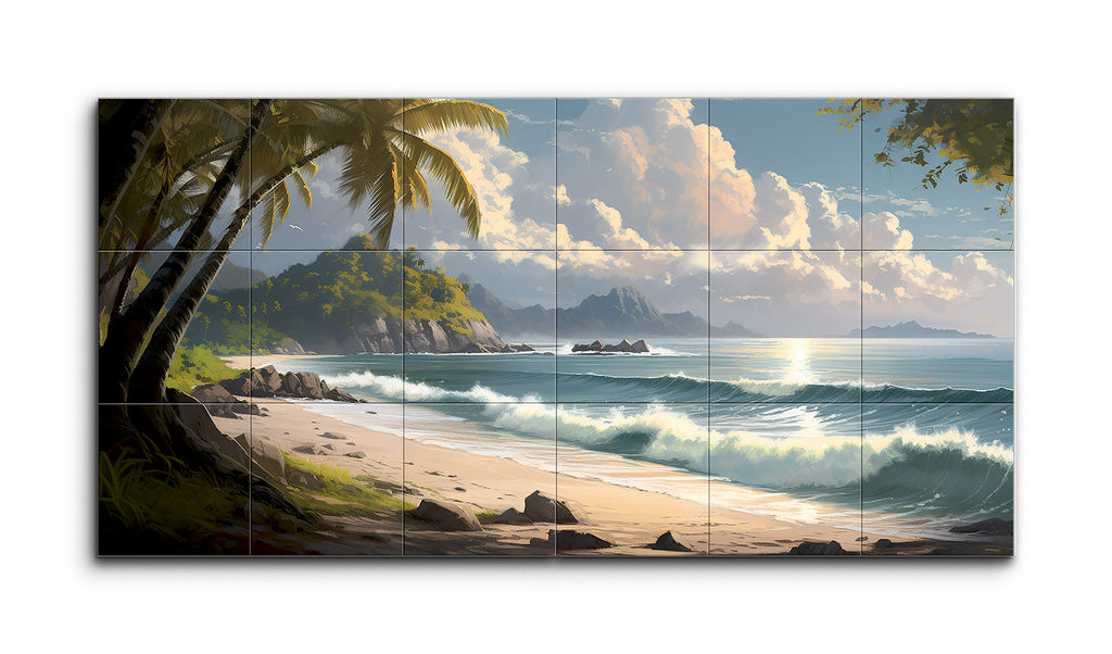 This tile mural captures a serene tropical beach scene with fine, golden sand in the foreground, dotted with small rocks and wave impressions. The vibrant blue-green sea features lively whitecaps. To the left, palm trees lean towards the ocean, casting shadows on the sand. The midground reveals a beach curving out of view, leading to a lush, rocky outcrop. The background showcases a calm ocean meeting a sky filled with fluffy clouds, bathed in warm sunlight, evoking a peaceful, idyllic escape.