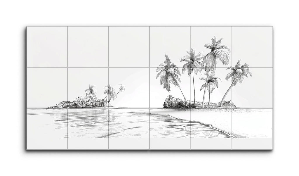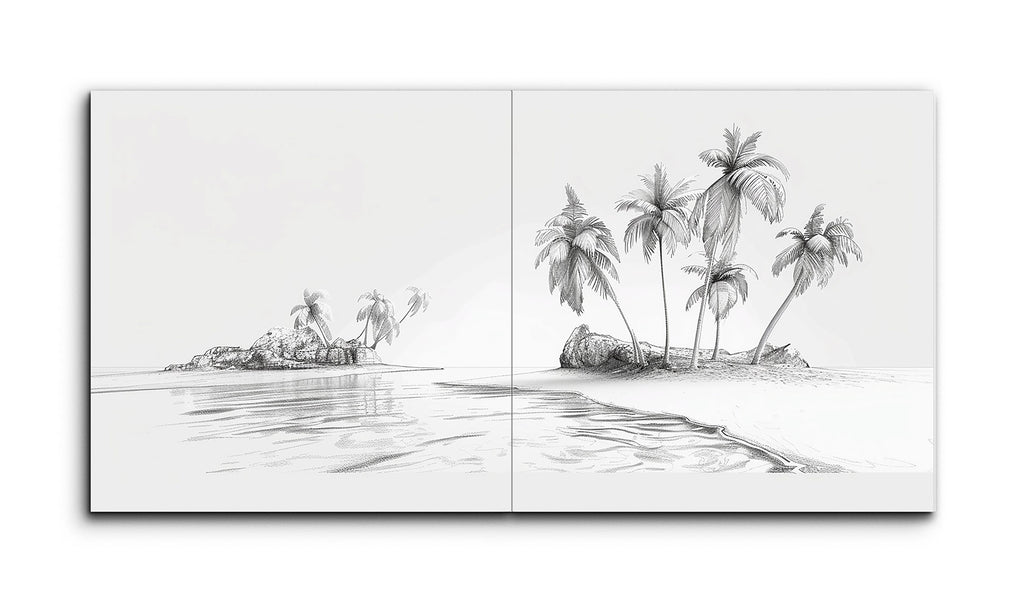This tile mural features a serene tropical beach scene in two panels. The left panel depicts a small island with a few palm trees, their reflections subtly mirrored on calm waters. The right panel offers a closer view of a sandy beach with detailed palm trees, their arching fronds swaying gently in a light breeze. Gentle waves lap against the shoreline, enhancing the peaceful ambiance. The minimalistic, monochromatic style with fine lines and shading emphasizes the elegance and simplicity of the natural scene.