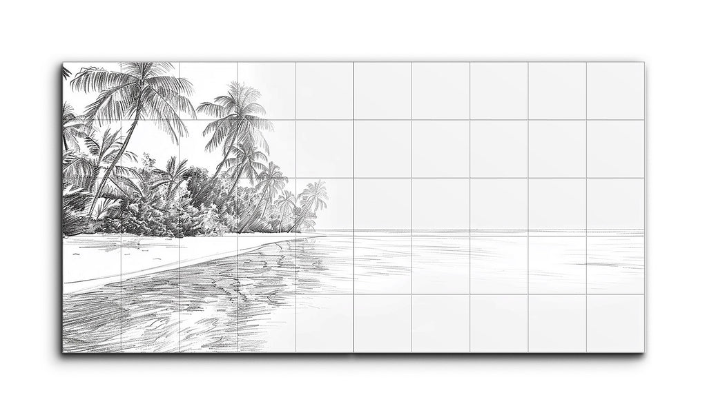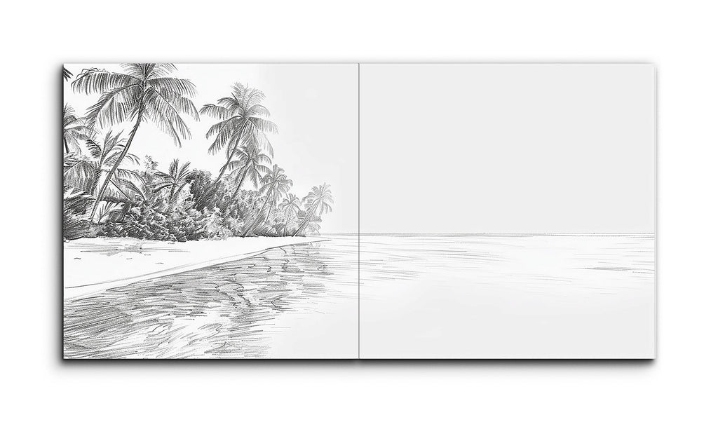 This artwork is a meticulously detailed black and white sketch capturing a serene tropical beach scene. On the left, a dense cluster of palm trees and lush tropical vegetation is depicted with intricate frond detailing, suggesting movement and texture. The gently curving shoreline leads the eye toward a calm sea, with fine lines indicating the sandy beach and subtle ripples in the water. The reflection of the palm trees adds to the tranquility, while the right side opens to an expansive, minimalist sea view, emphasizing vastness and calmness. The realistic style and fine details give the piece a timeless quality, showcasing the artist's skill in capturing the essence of a peaceful tropical beach.