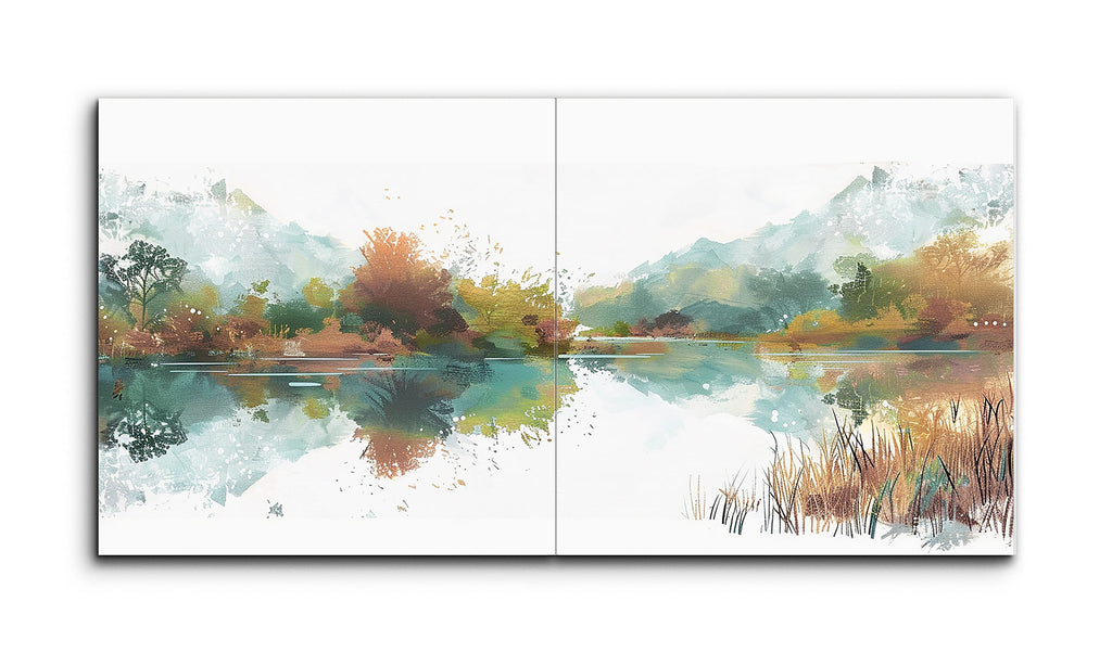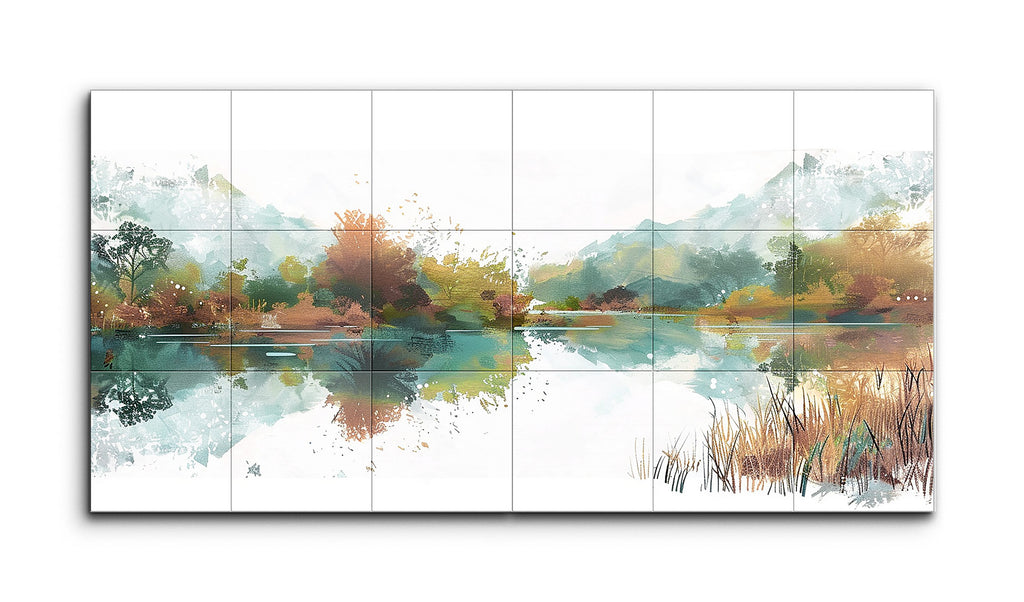 This diptych tile mural captures a tranquil landscape inspired by nature’s serene beauty. Semi-abstract and impressionistic, it features soft, harmonious colors—greens, blues, oranges, and whites—that evoke calm. The foreground shows expressive strokes of grass or reeds, leading to a mirrored lake or river in the middle ground. Abstracted autumnal trees and distant, cooler-toned mountains form the background, creating depth. Subtle light and shadow enhance the peaceful ambiance, inviting contemplation of the serene vista.