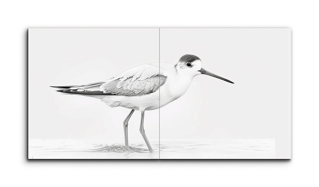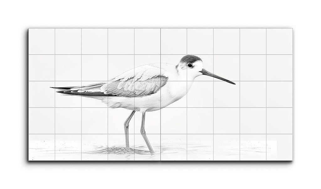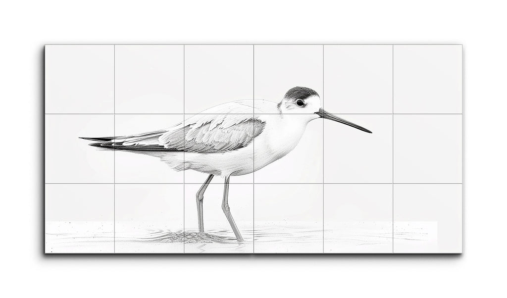 This tile mural features a meticulously detailed depiction of a wader bird, characterized by its long legs and elongated beak, hinting at its foraging habits in shallow waters. Rendered in a monochromatic palette, the fine lines and shading create a rich texture and depth, capturing the bird in profile with remarkable realism. The minimal background, with subtle horizontal lines, ensures the bird remains the focal point, emphasizing its natural elegance and anatomy. The artwork exudes a serene, contemplative quality.