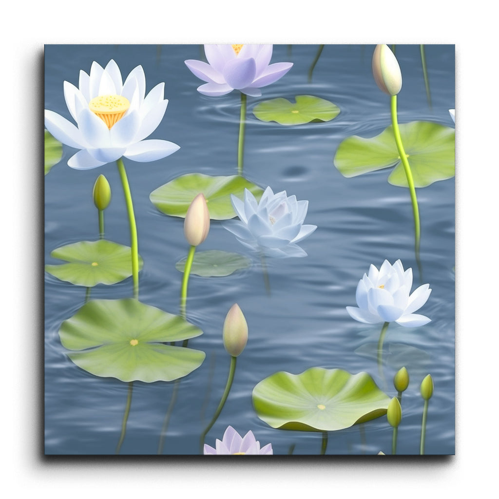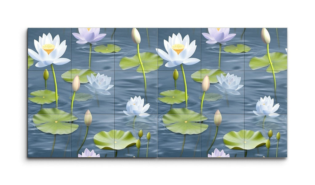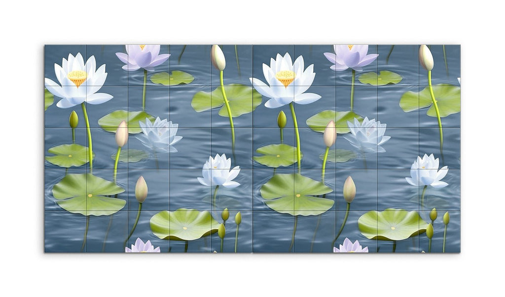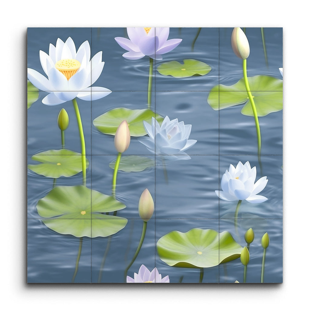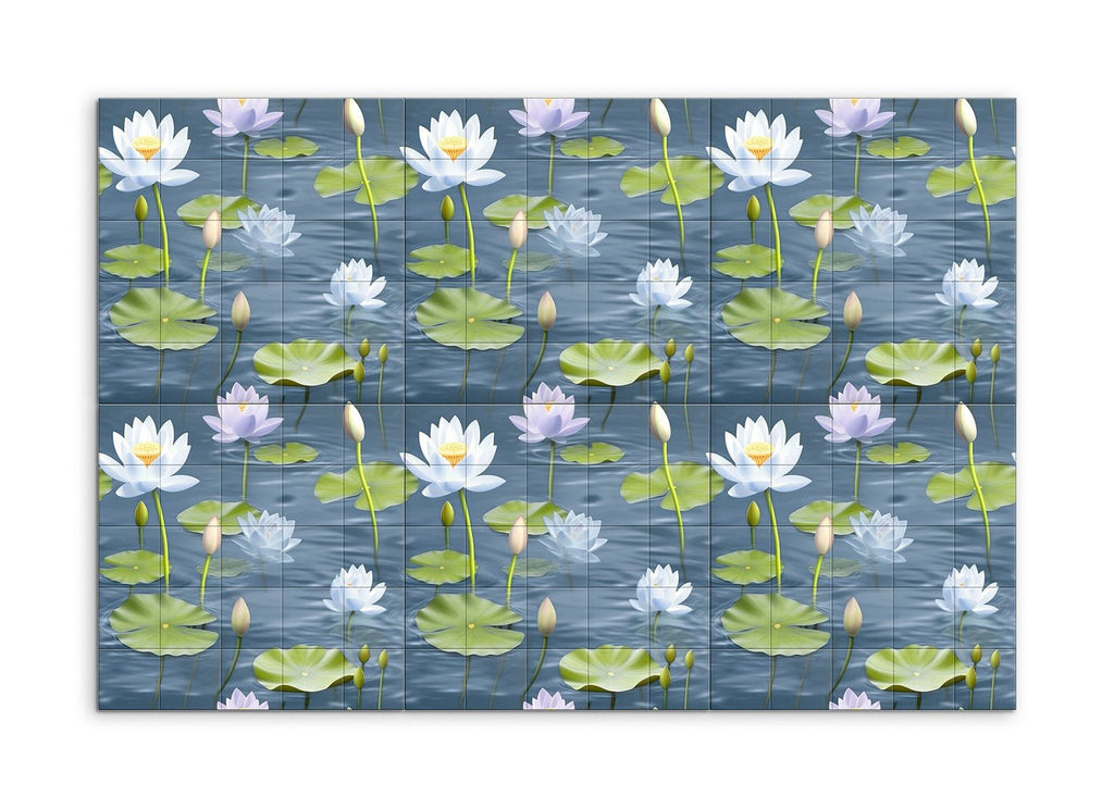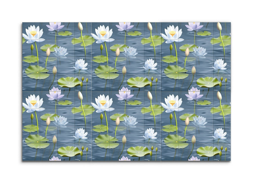 Transform your space with this captivating tile mural featuring a serene aquatic scene of water lilies in various stages of bloom. Delicate petals in shades of white, light pink, and soft purple, alongside large, round green lily pads, float gracefully on calm, glassy water. Subtle ripples and reflections add depth, while the harmonious colors and balanced composition evoke a sense of tranquility and natural beauty. Ideal for creating a peaceful ambiance in any setting.