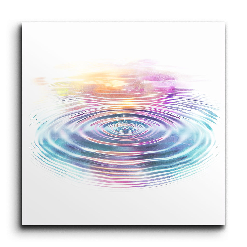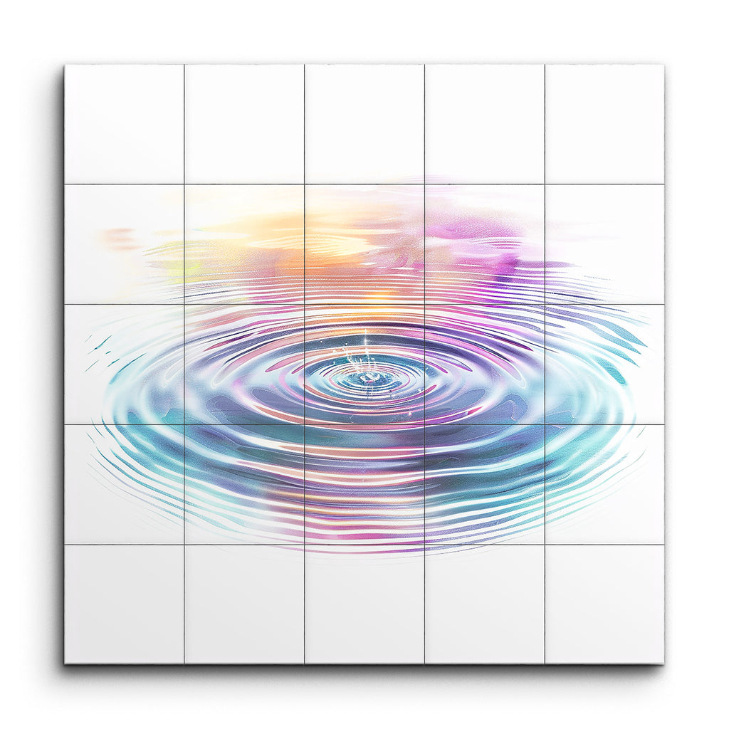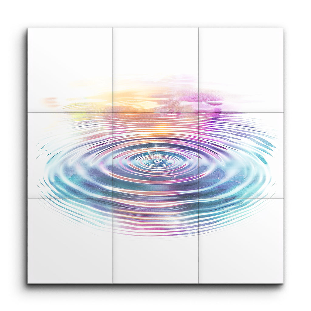 Experience tranquility with our captivating tile mural, showcasing the serene beauty of water ripples. At its heart, a single droplet creates concentric circles, radiating a soothing calm. The colors transition seamlessly from cool blues and purples to warm pinks, oranges, and yellows, adding vibrancy to this peaceful scene. Above, a subtle blur of colors mirrors the hues below, adding depth and a dreamlike quality. Modern and minimalist, this artwork invites a moment of peace and contemplation.