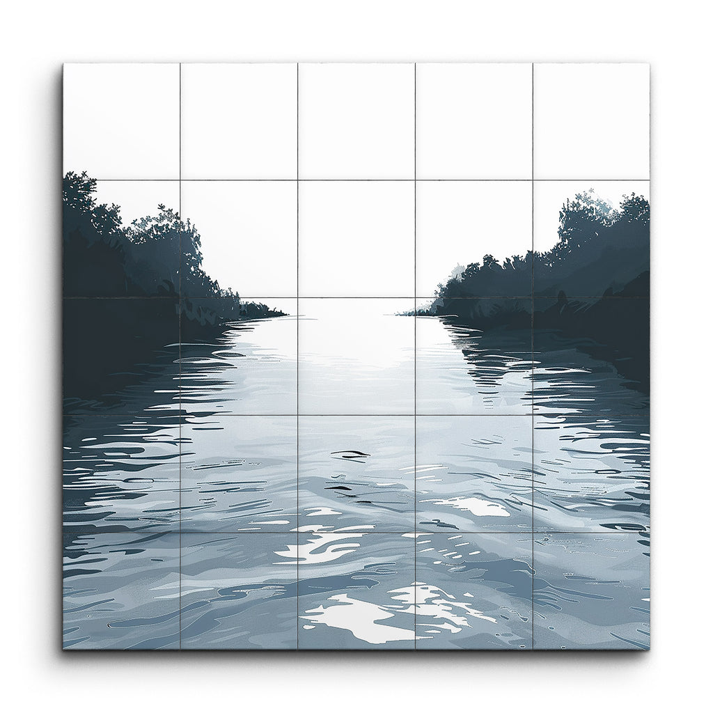 Immerse yourself in tranquility with this captivating tile mural, featuring a serene water scene framed by dense foliage. The minimalist design showcases smooth, glass-like water with gentle ripples and reflections, contrasted by dark, muted tones of the surrounding greenery. Dominated by cool shades of blue and gray, the artwork exudes a contemplative mood, inviting viewers to explore the depth and calm of the scene. The horizon merges water and sky, evoking a sense of infinite space and peace.