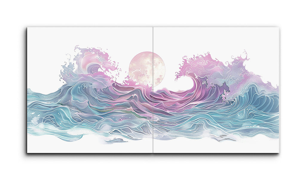 This digital artwork portrays a stylized ocean wave scene, split into two panels forming a cohesive diptych. The dynamic sea is captured through flowing lines and curves that echo the natural rhythm of waves. A pastel palette of blues, purples, and pinks creates a serene, surreal atmosphere. At the horizon, where the panels meet, a circular motif resembling a sun or moon adds a dreamlike touch. The blend of realism and fantasy, with calligraphic lines, conveys the ocean's tranquil and majestic beauty.