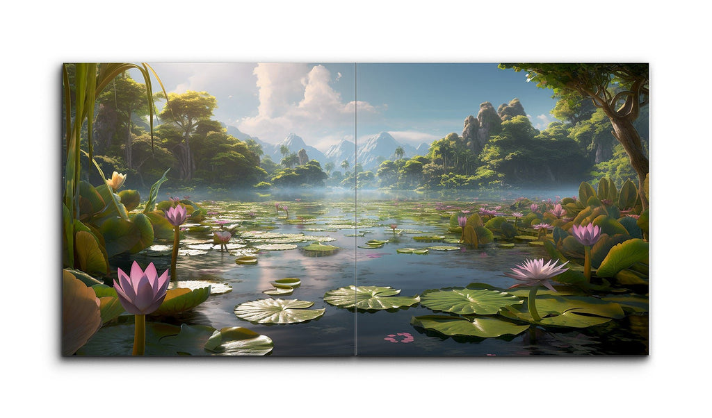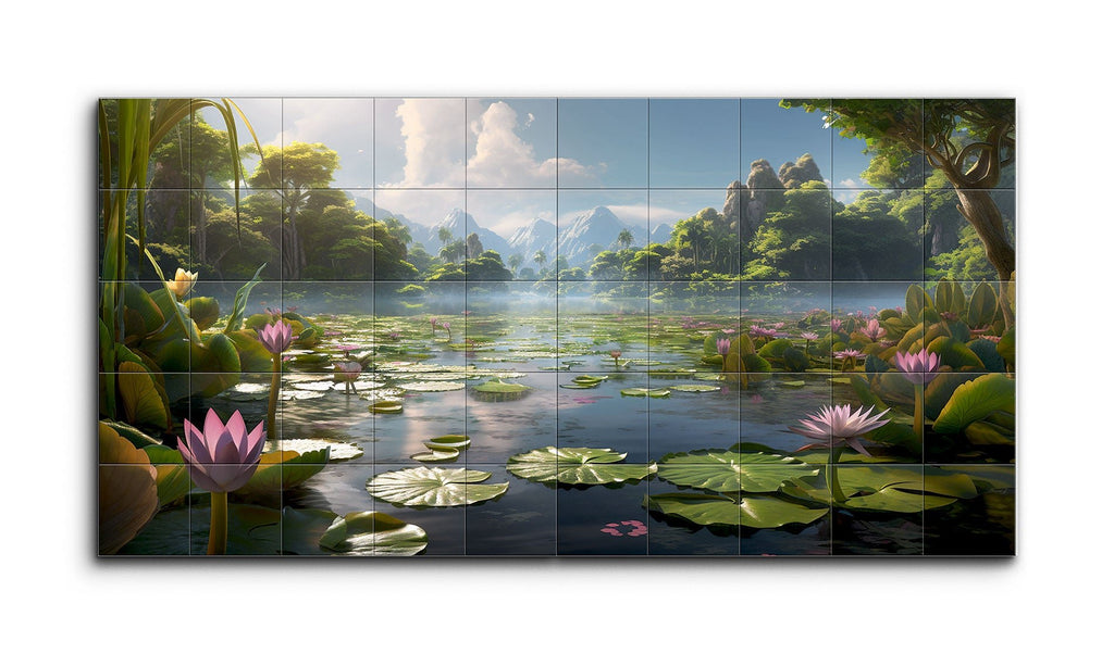 This tile mural showcases a serene landscape set in a lush wetland or marsh. The scene features calm waters reflecting the sky and surrounding foliage, with vibrant water lilies in bloom adding splashes of pink and purple. Majestic rocky outcroppings or mountains, partially shrouded in mist, rise in the background, creating a sense of grandeur. The soft, diffused lighting and realistic textures, from lily pads to distant trees, give the artwork a lifelike quality, making it visually soothing and aesthetically pleasing.