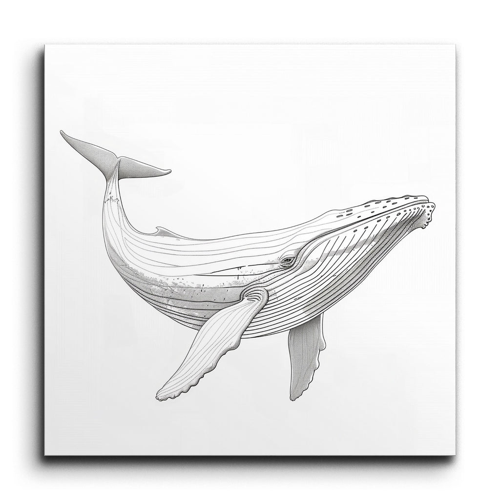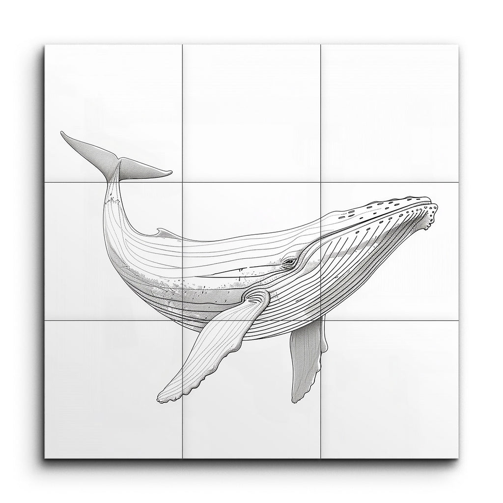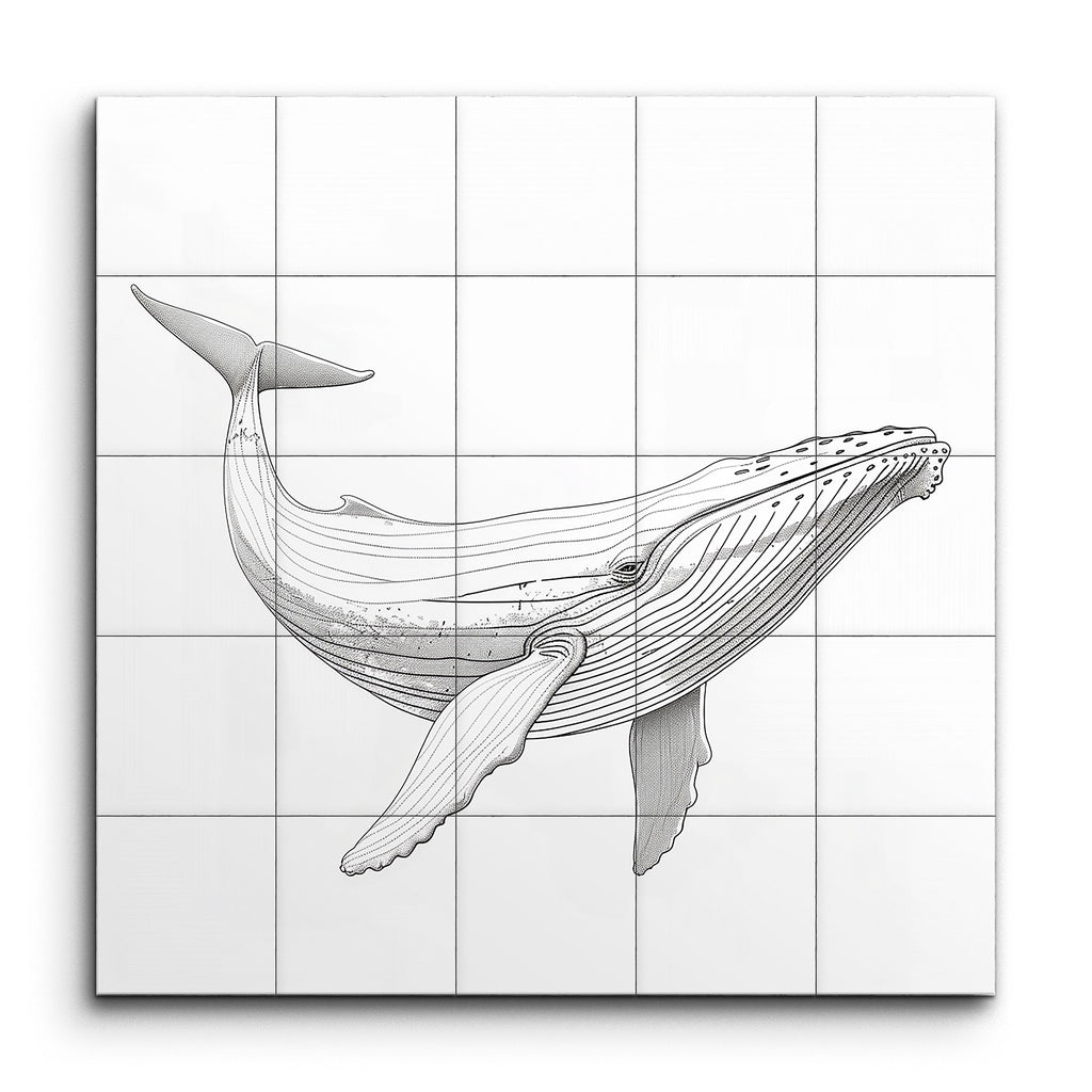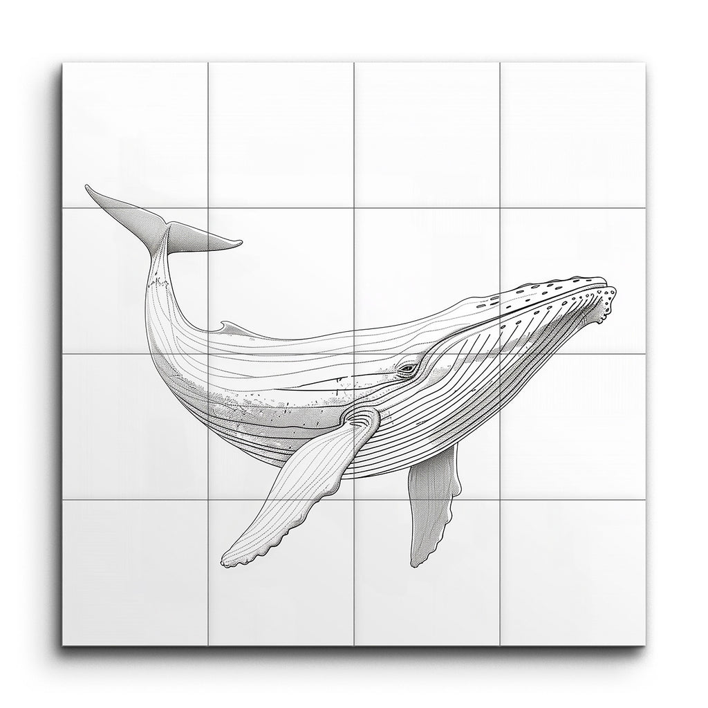 Immerse yourself in the serene elegance of our tile mural featuring a meticulously detailed whale illustration. Crafted with fine, precise lines, the artwork beautifully captures the whale's form and texture, with varying line thickness adding depth and dimension. The subtle cross-hatching and varied line density create a stunning three-dimensional effect. This blend of scientific accuracy and artistic finesse, rendered in a monochromatic palette, brings a touch of sophistication and tranquility to any space.