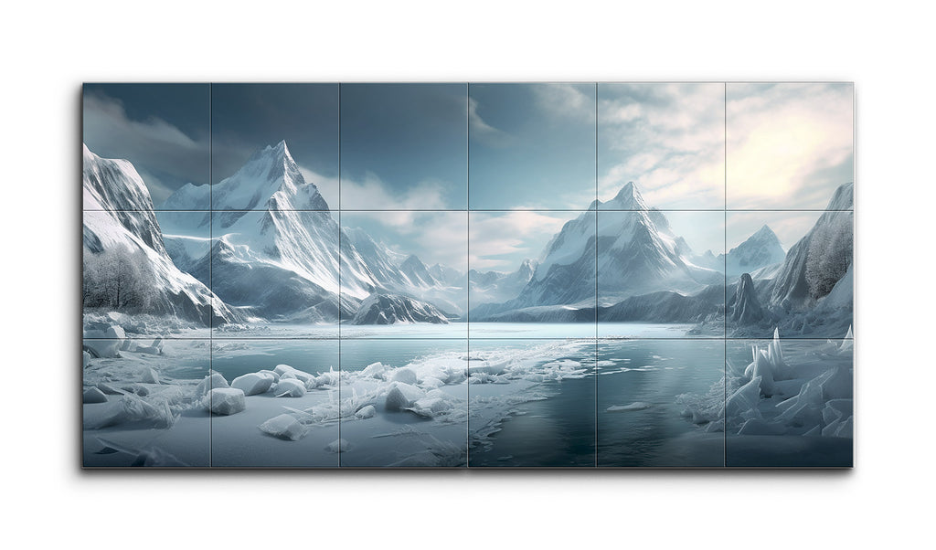 This diptych tile mural captures a serene winter landscape inspired by polar or high mountain regions. The cool, subdued shades of blue and white convey coldness and tranquility, with soft dawn or dusk light enhancing the ethereal atmosphere. A frozen body of water with ice formations lies in the foreground, while towering, snow-covered mountains with sharp peaks dominate the middle ground. The overcast sky with lighter clouds near the horizon suggests a break in the weather, adding depth to this majestic scene.