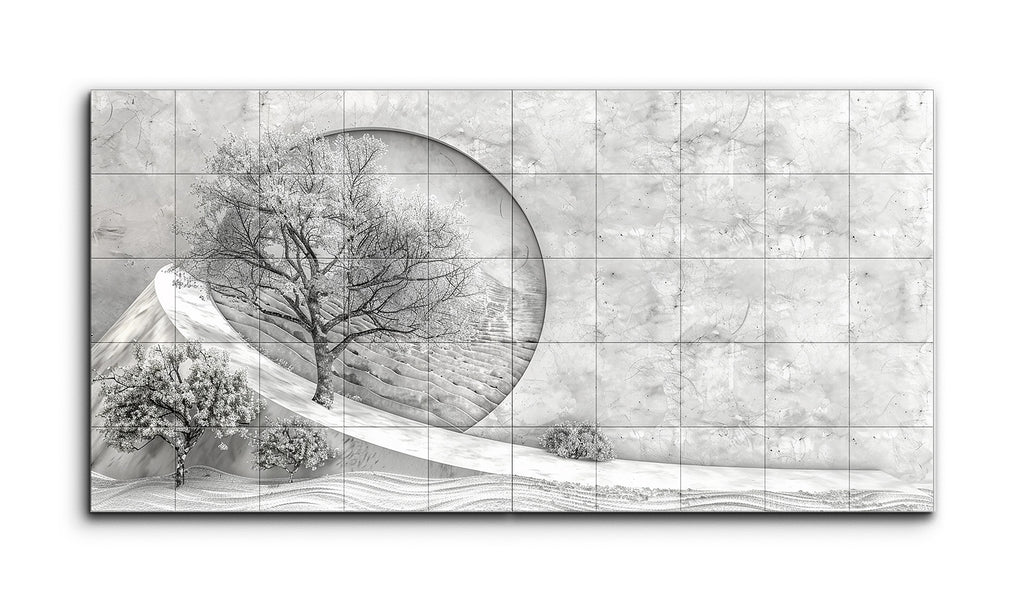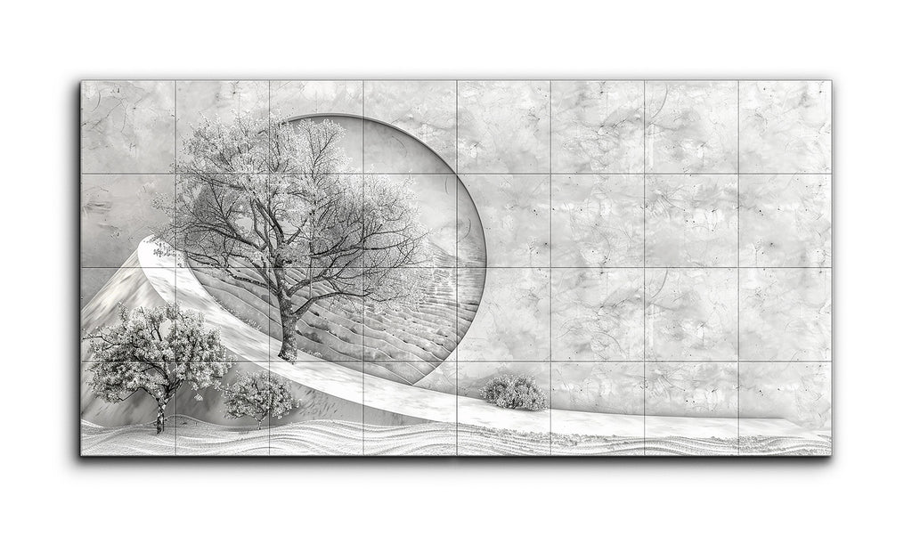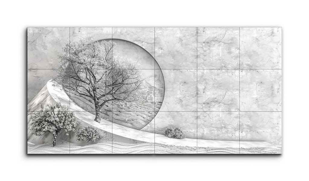 This tile mural presents a serene, monochromatic winter landscape. The focal point is a large, leafless tree with intricate, snow-covered branches, positioned slightly to the left within a circular frame. Below, the ground is smoothly blanketed in snow, evoking calmness. A smaller snow-covered bush to the left balances the composition. The background features rolling, snow-covered hills that recede into the distance, adding depth. The minimalist yet detailed style, along with the monochromatic palette, enhances the tranquil atmosphere.