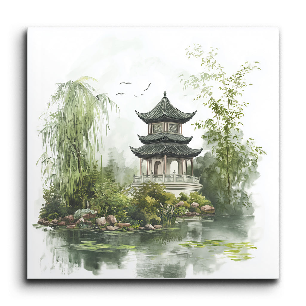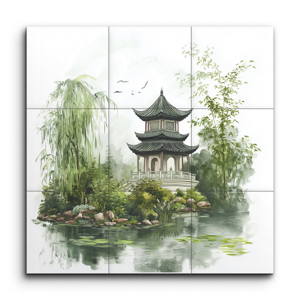 This tile mural captures a tranquil East Asian garden scene. A traditional pagoda with tiered, curved roofs stands at the center, surrounded by lush foliage. A graceful willow tree leans over a reflective body of water, its branches hanging elegantly. The garden is rich with diverse plants and rocks, adding depth and texture. Birds soar in the sky, infusing the scene with gentle movement. The artwork, reminiscent of traditional Chinese landscape painting, uses delicate brushwork and a harmonious palette of soft greens and muted tones.