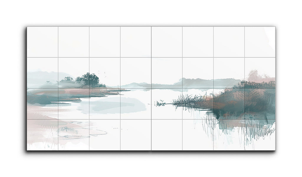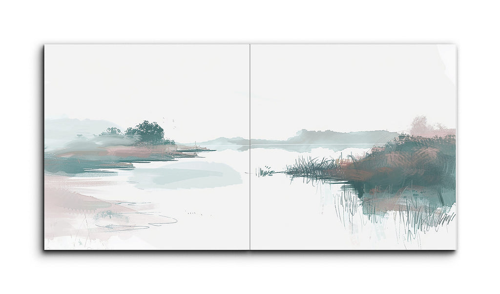 This diptych tile mural showcases a tranquil, natural landscape through a blend of abstract and impressionist techniques. The left panel depicts a serene body of water, perhaps a calm lake or river, with reflective blues and greens. A distant shoreline in muted earth tones hints at sparse vegetation. The right panel features more defined brushwork, suggesting reeds or grasses at the water's edge, creating depth with layers of color and texture. The minimalist composition flows seamlessly, evoking a serene, contemplative atmosphere.
